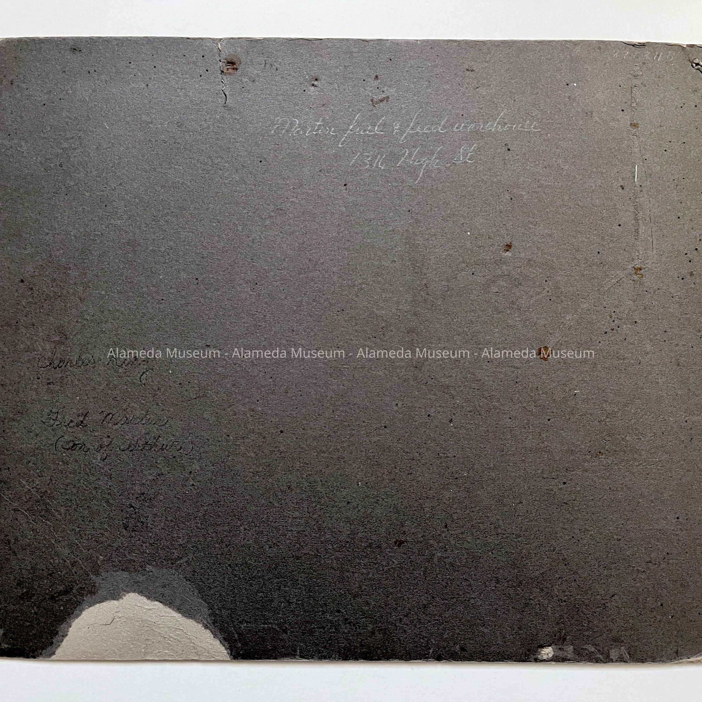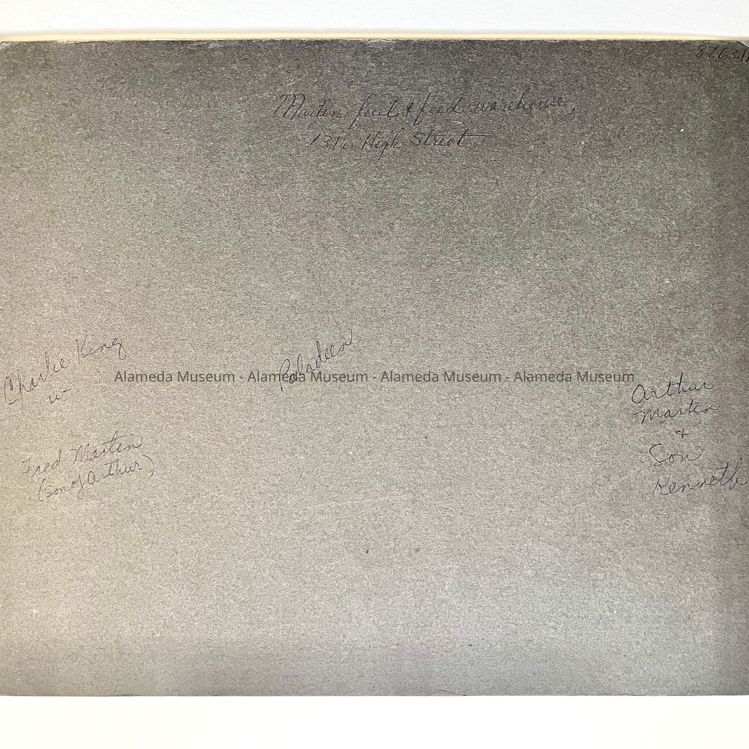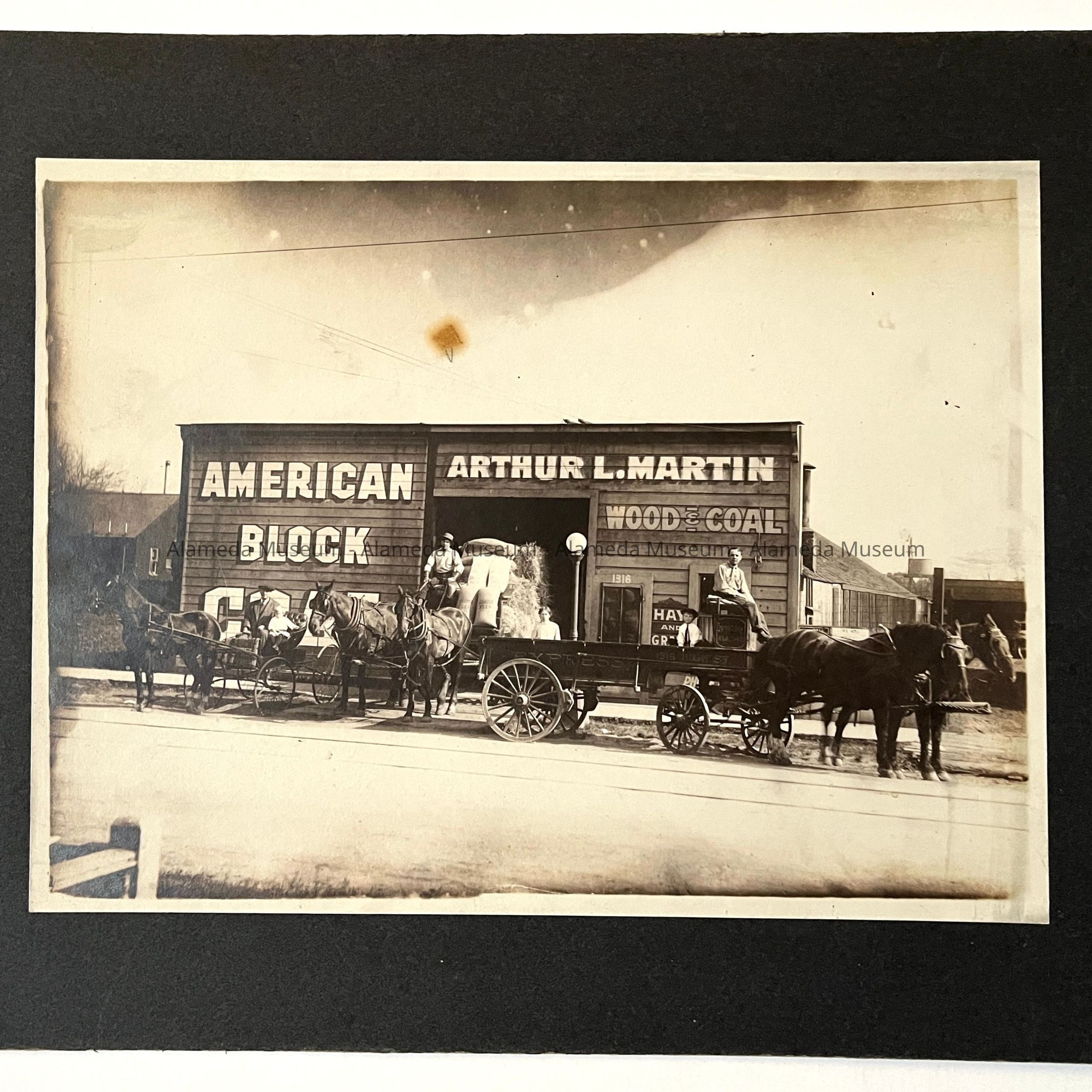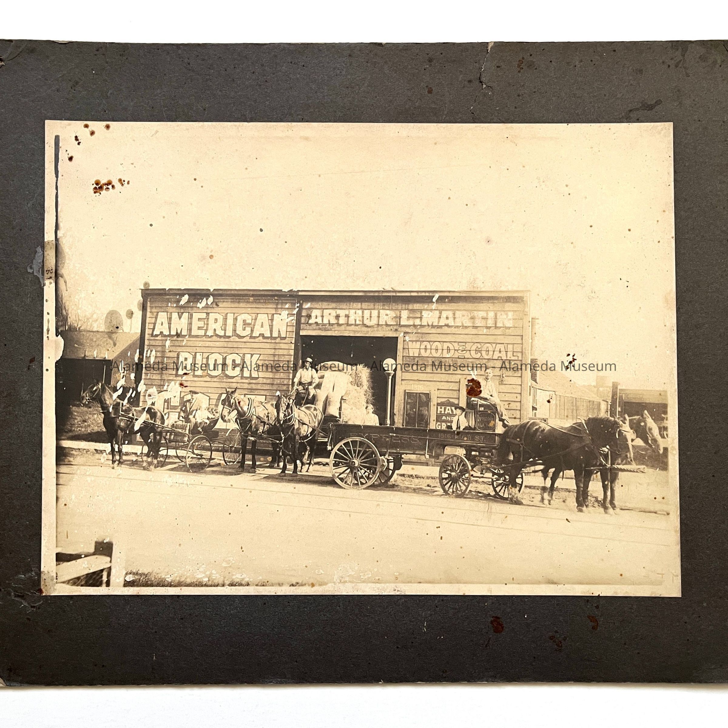 Photo of the exterior of the Arthur L. Martin fuel & feed warehouse, including horses & wagons, 1316 High Street, Alameda.