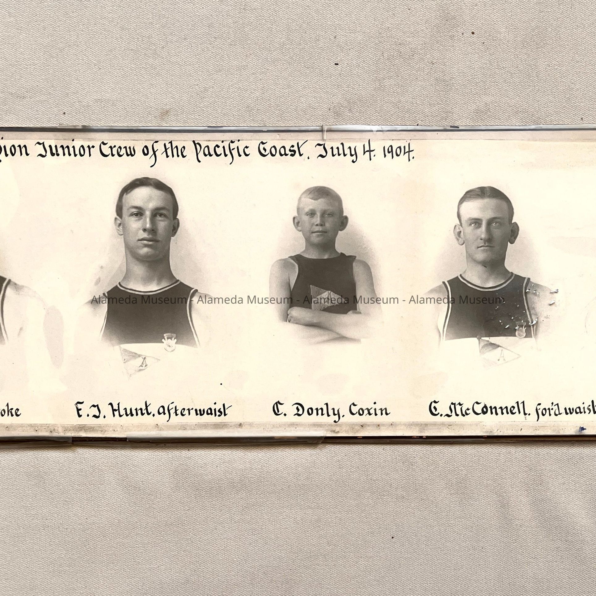 History of Object: Champion Junior Crew of the Pacific Coast, July 4, 1904, showing the five crewmen's portraits, identified by name.