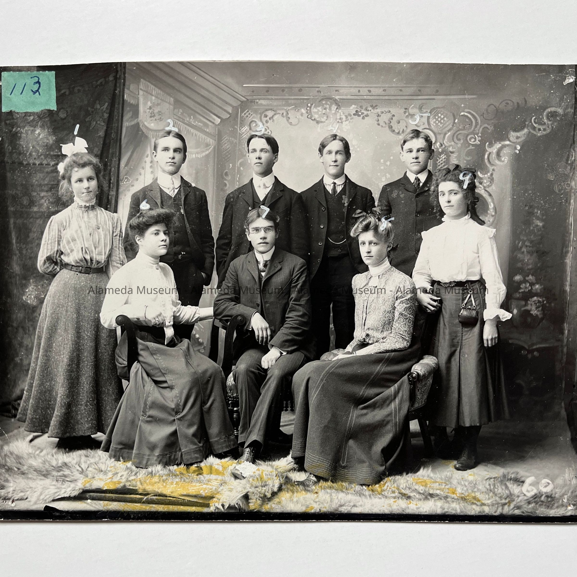Description: Modern glossy black/white contact print, unmounted. Original photographer unknown. The image is damaged by: tack holes in all corners, a yellowish glue residue about 1-in. high extending along the bottom edge, an old green cataloging label affixed on the upper left corner, and creasing at the lower left corner.