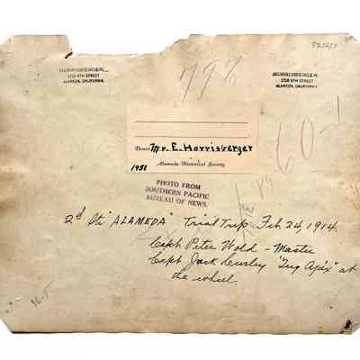 History of Object: Southern Pacific ferry boat "Alameda" on a trial trip, Feb. 24, 1914. Its officers are identified on the verso.