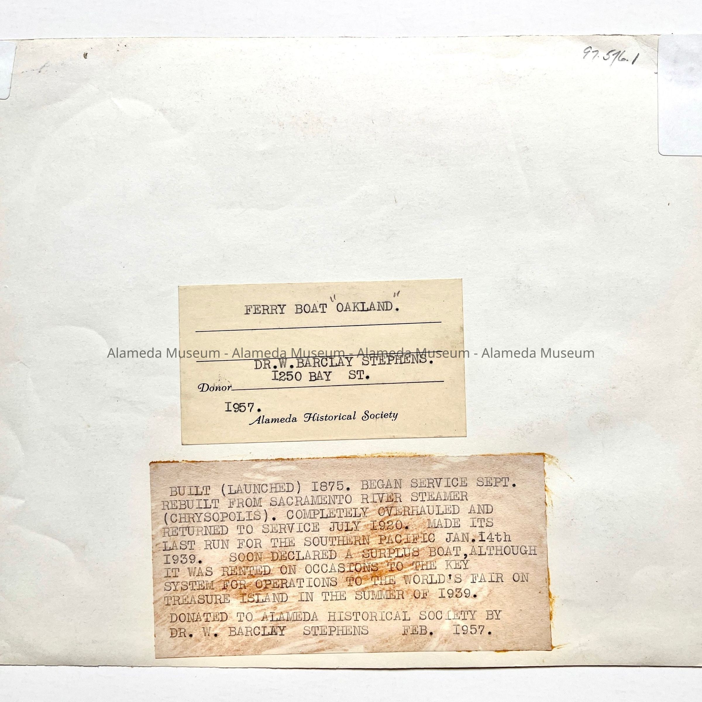 History of Object: Ferry boat "Oakland". It was built in 1975, originally as a Sacramento River steamer, but was completely overhauled and returned to service in San Francisco Bay in July, 1920. It made its last run for Southern Pacific on Jan. 14, 1939. Subsequently it served as a charter during the G.G.I.E. in 1939.