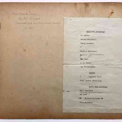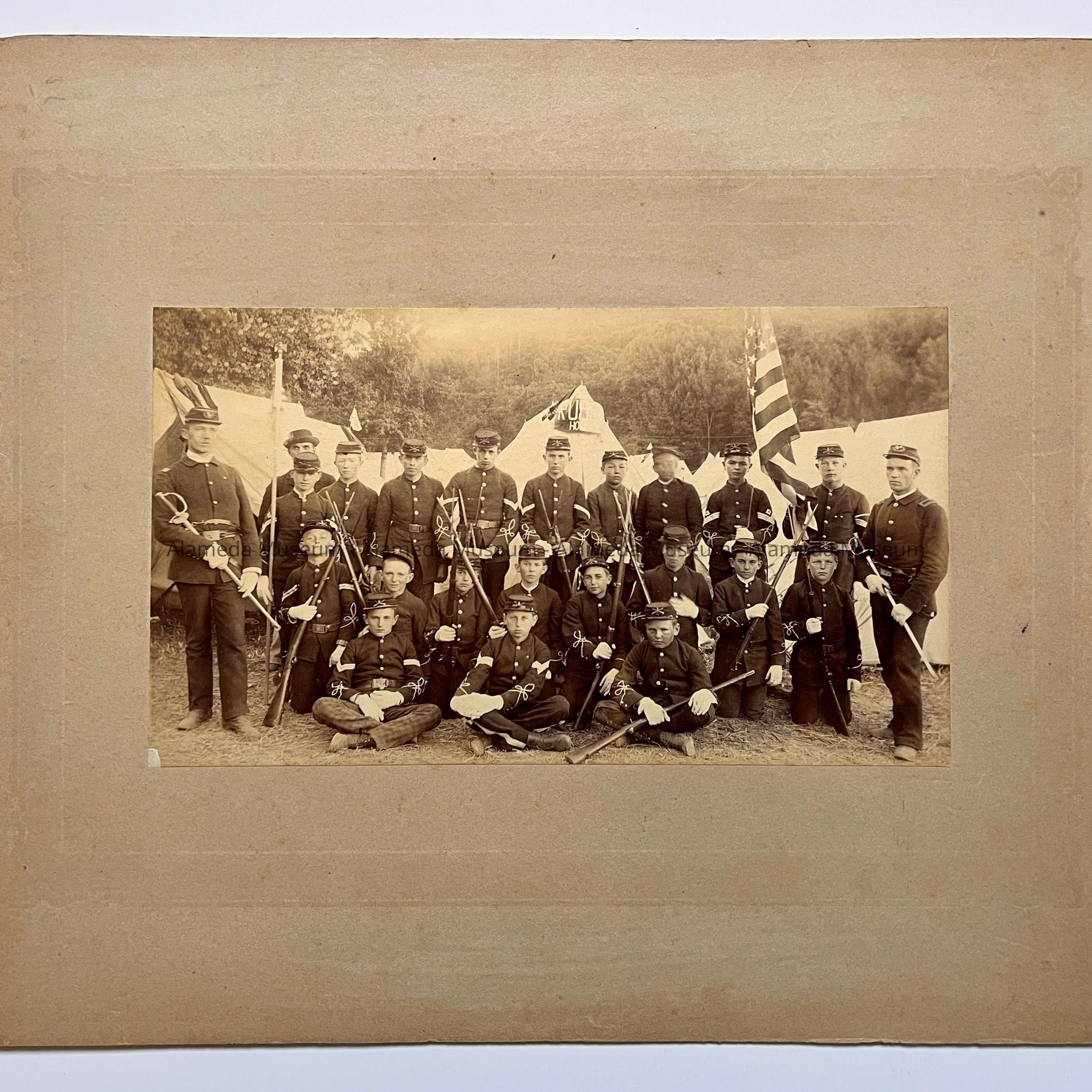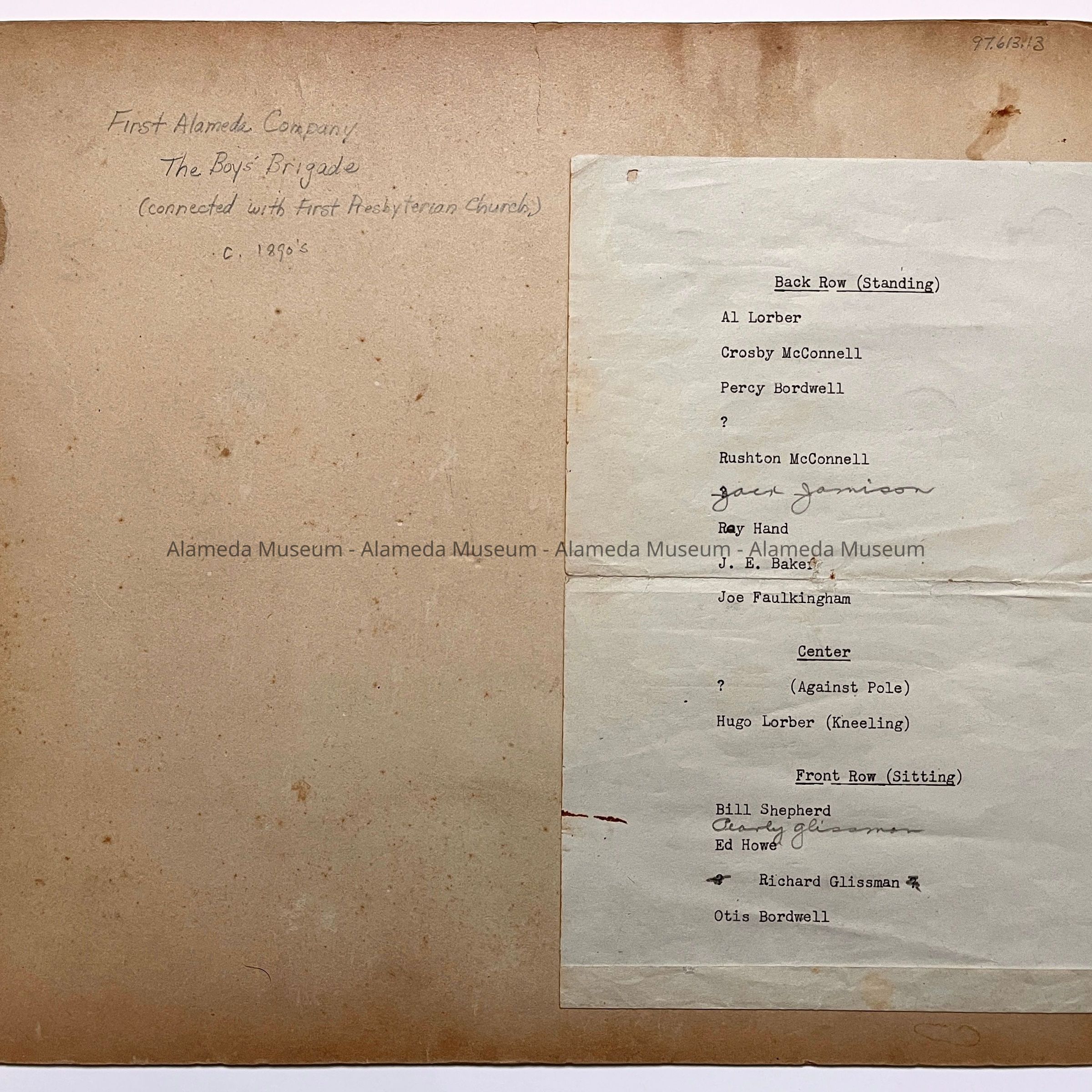 HISTORY OF OBJECT: PHOTOGRAPH OF THE MEMBERS OF THE FIRST ALAMEDA COMPANY, BOYS' BRIGADE, AFFILIATED WITH THE FIRST PRESBYTERIAN CHURCH. MEMBERS OF THE LORBER FAMILY WERE ACTIVE IN THIS GROUP, INCLUDING HUGO LORBER, FIRST SERGEANT. PRIVATES IN THE BRIGADE INCLUDED ALFRED LORBER. ALSO INCLUDED IS A TYPEWRITTEN LIST ON THE REVERSE SIDE, IDENTIFYING SOME OF THE MEMBERS PICTURED.
