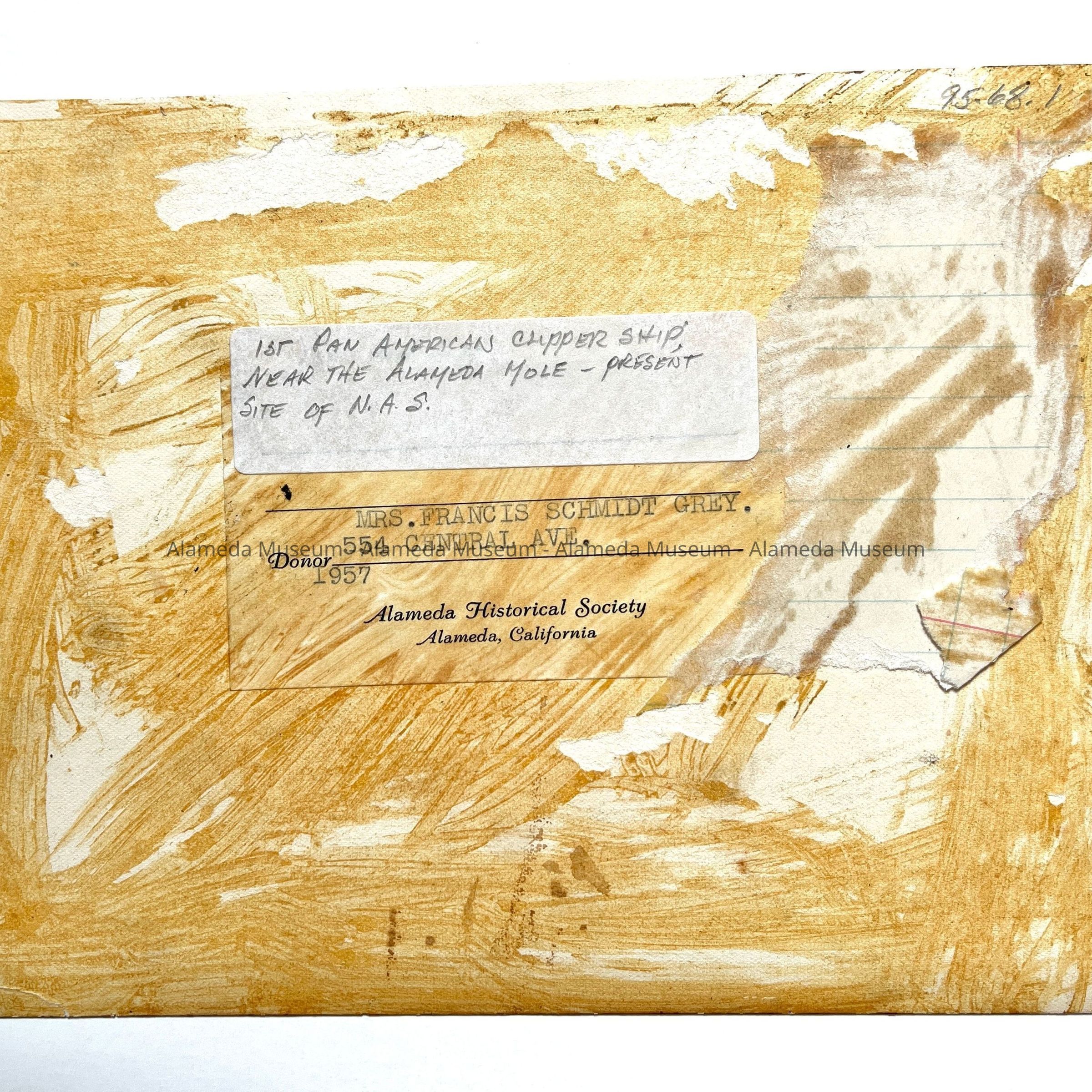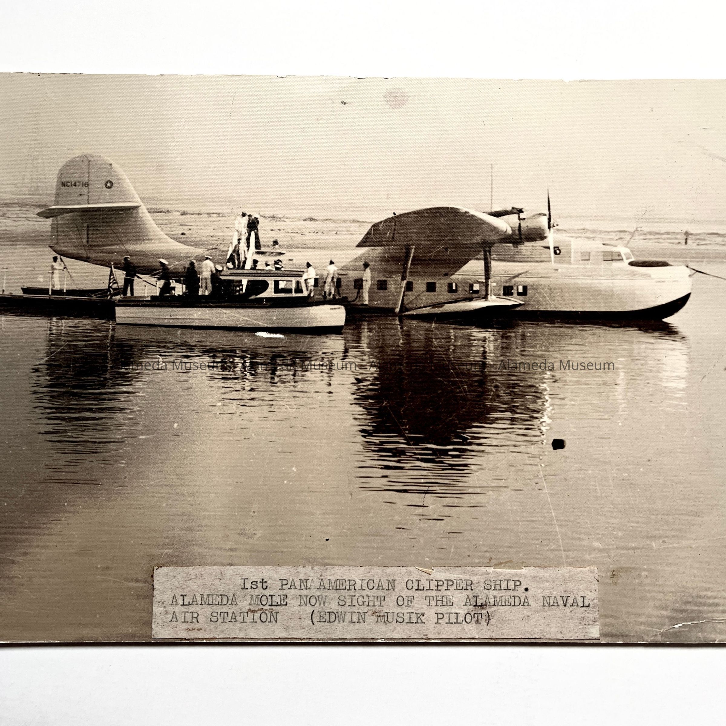 History of Object: View identified as that of the First Pan American clipper ship, stationed near the Alameda Mole, present site of the NAS. Edwin Muesik is identified as the pilot.