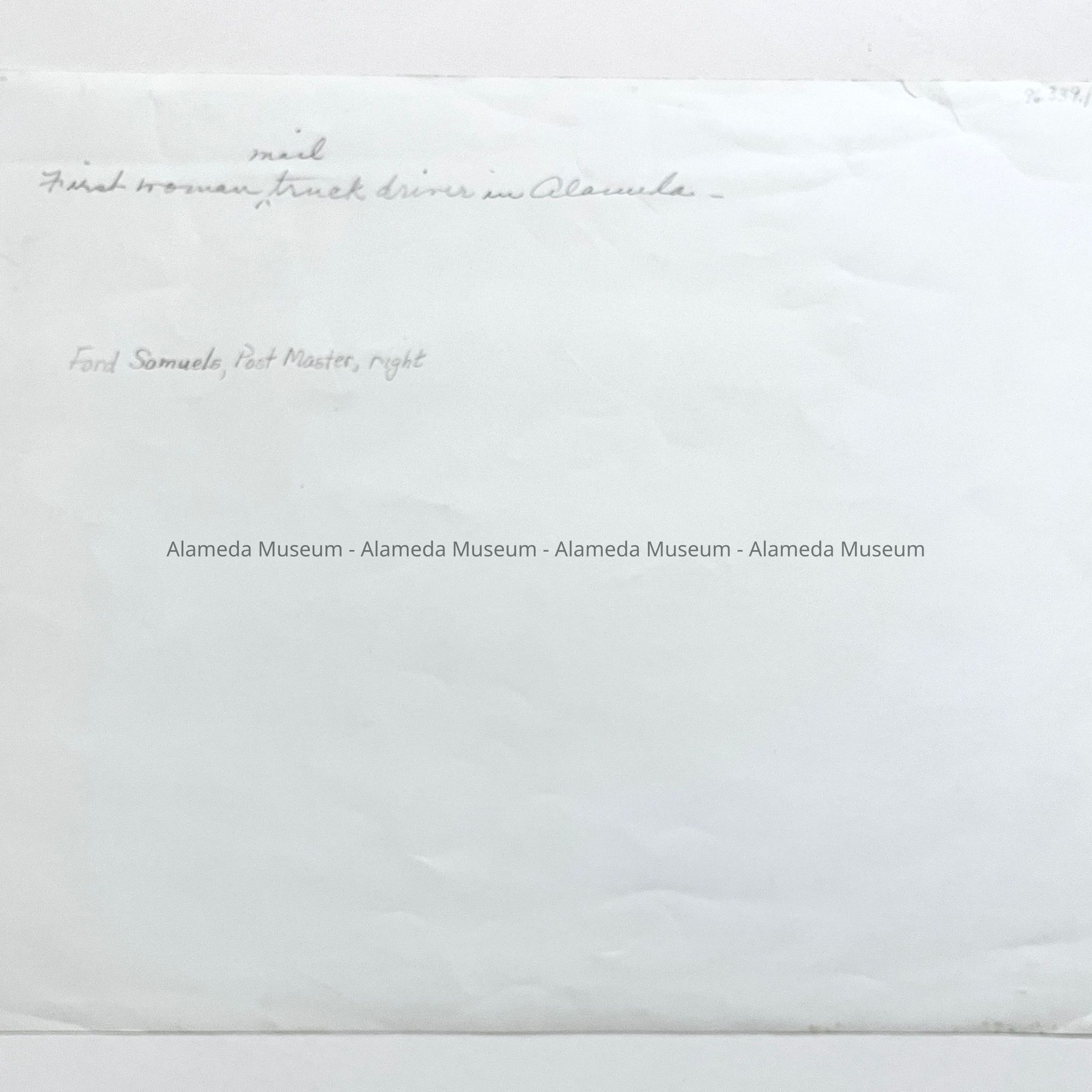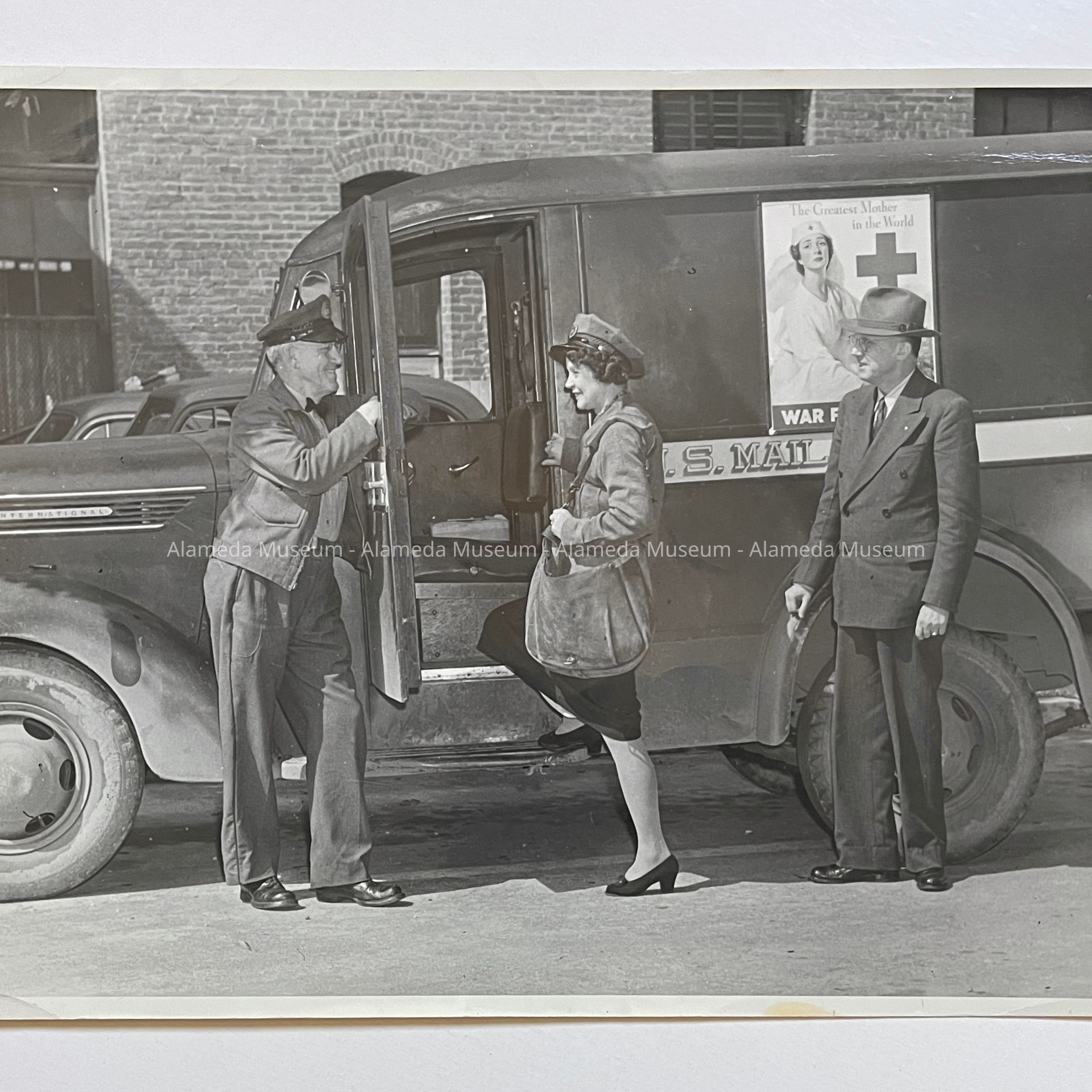 PHOTOGRAPH DEPICTING AN UNIDENTIFIED WOMAN IN UNIFORM, BOARDING A UNITED STATES MAIL TRUCK, ACCOMPANIED BY FORD SAMUEL, POSTMASTER, AND AN UNIDENTIFIED MALE POSTMAN. CAPTION ON REVERSE SIDE READS, "FIRST WOMAN MAIL TRUCK DRIVER IN ALAMEDA."