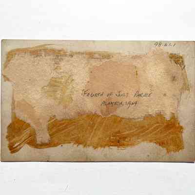 Unmounted, but with the residue of tan scrapbook paper on the verso. Not postally used. A white typed description label is glued along the bottom margin.