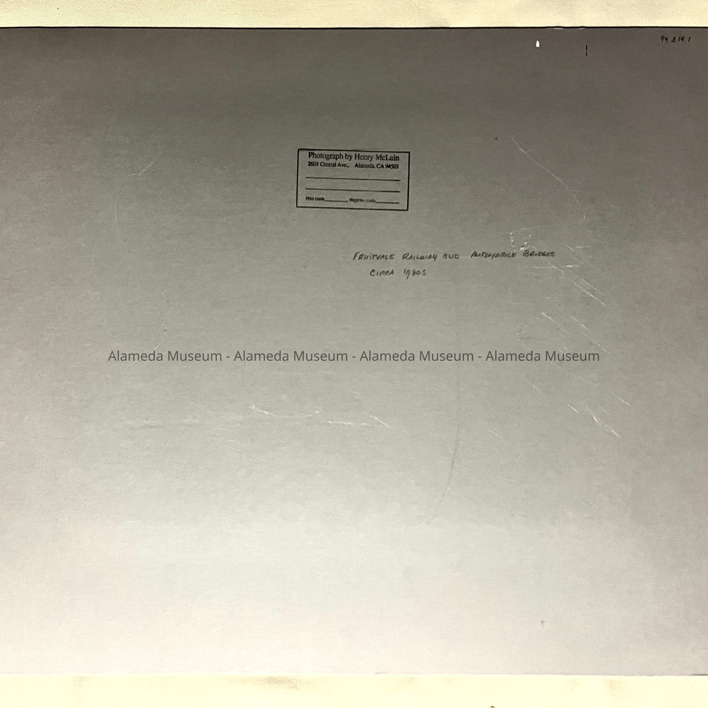 History of Object: View of the Fruitvale railway and automobile bridges taken from the Alameda shoreline. The photographer, Mr. McLain, did serious photography for over 25 years throughout California. He joined the Alameda Photographic Society when he was 90 years old. (See biographical information attached to the back of this card.)