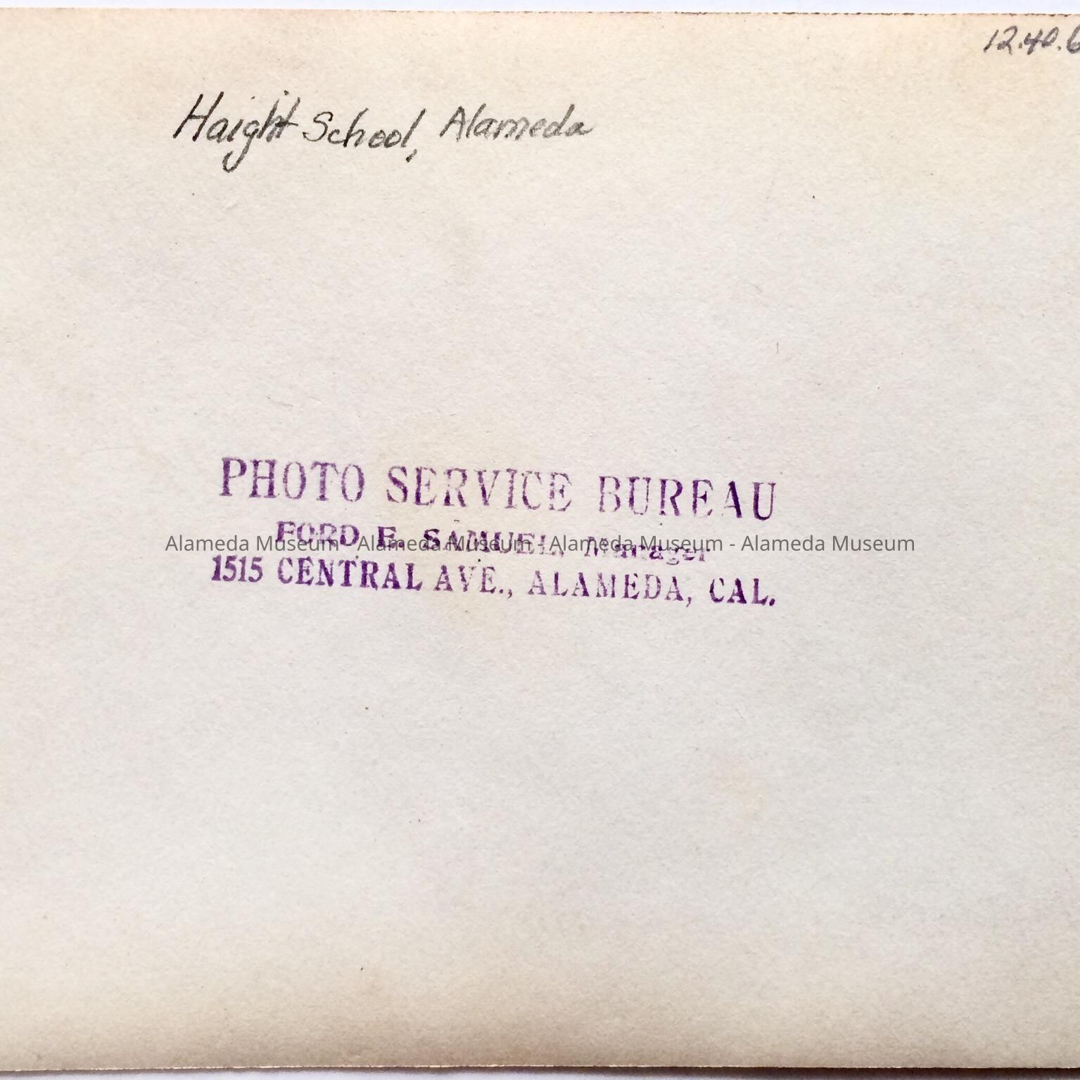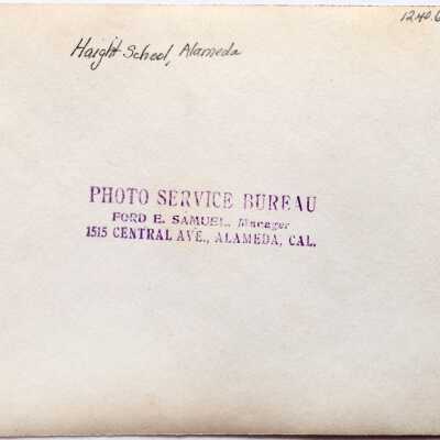 DESCRIPTION: A BLACK-AND-WHITE PHOTO SIGNED ON THE REVERSE SIDE, "PHOTO SERVICE BUREAU, FORD E. SAMUEL, MANAGER, 1515 CENTRAL AVENUE, ALAMEDA."