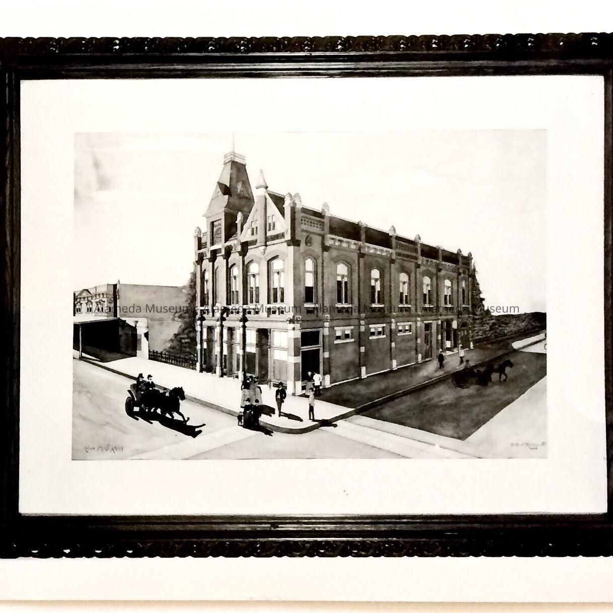 History of Object: Photograph of the architectural rendering of the original Alameda Masonic Hall, Park St. and Alameda Ave., erected in 1890. The sketch also includes the mat and original frame. Adjacent to the illustration is historical information concerning the building. The photograph was given out as a souvenir of "Old Timers Night" April 21, 1960.