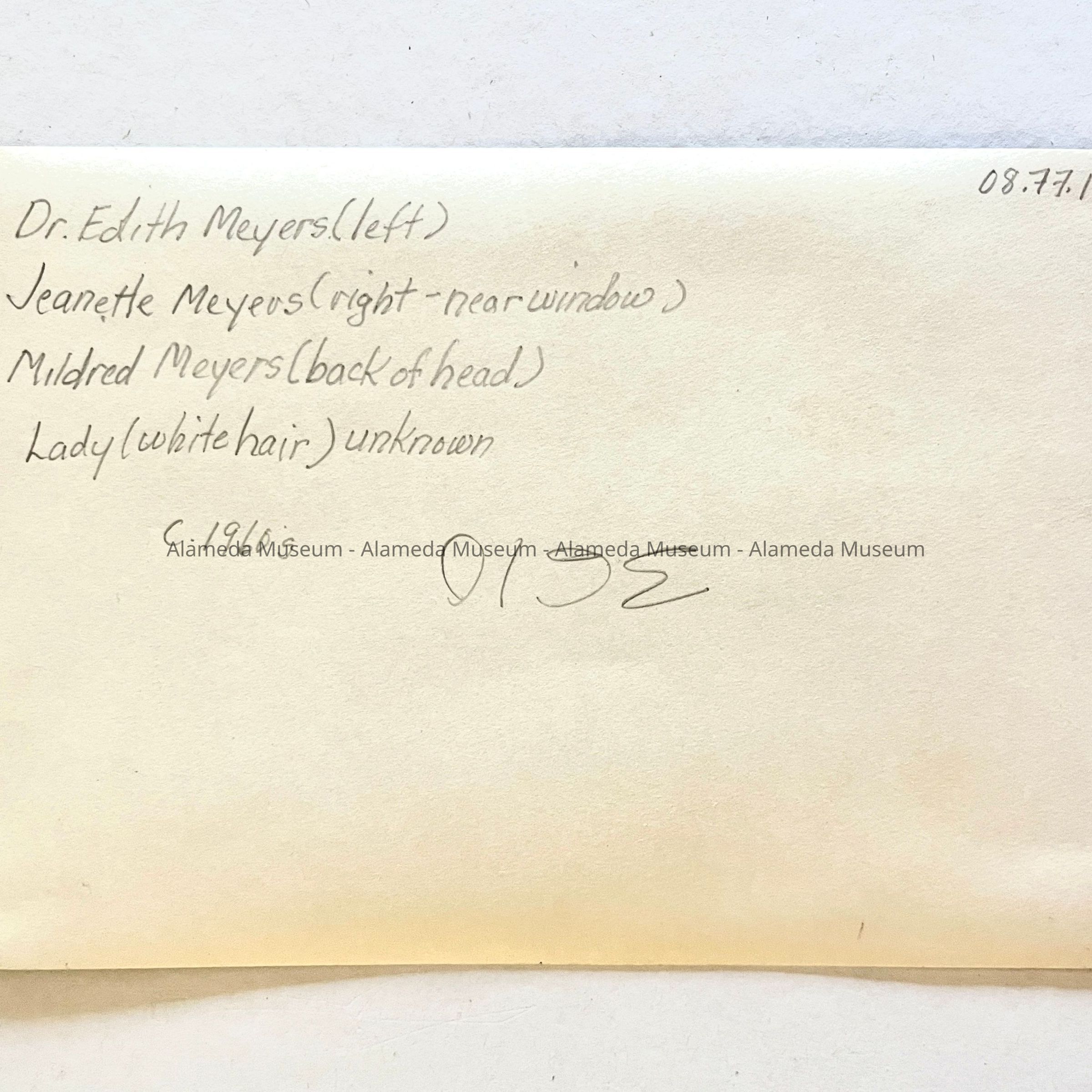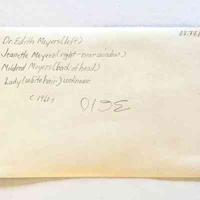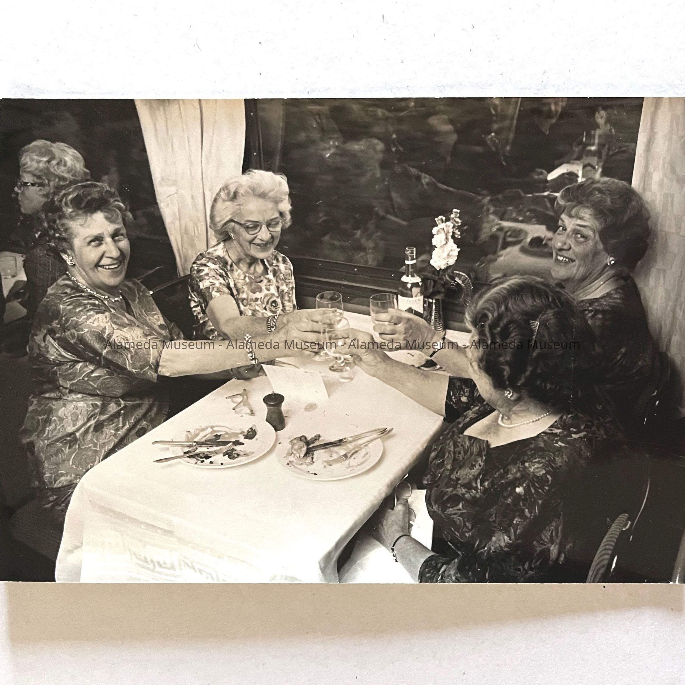 HISTORY OF OBJECT: A PHOTO OF THE MEYER’S SISTERS, WITH AN UNIDENTIFIED WOMAN SITTING AT A TABLE ABOARD A RAILROAD TRAIN.