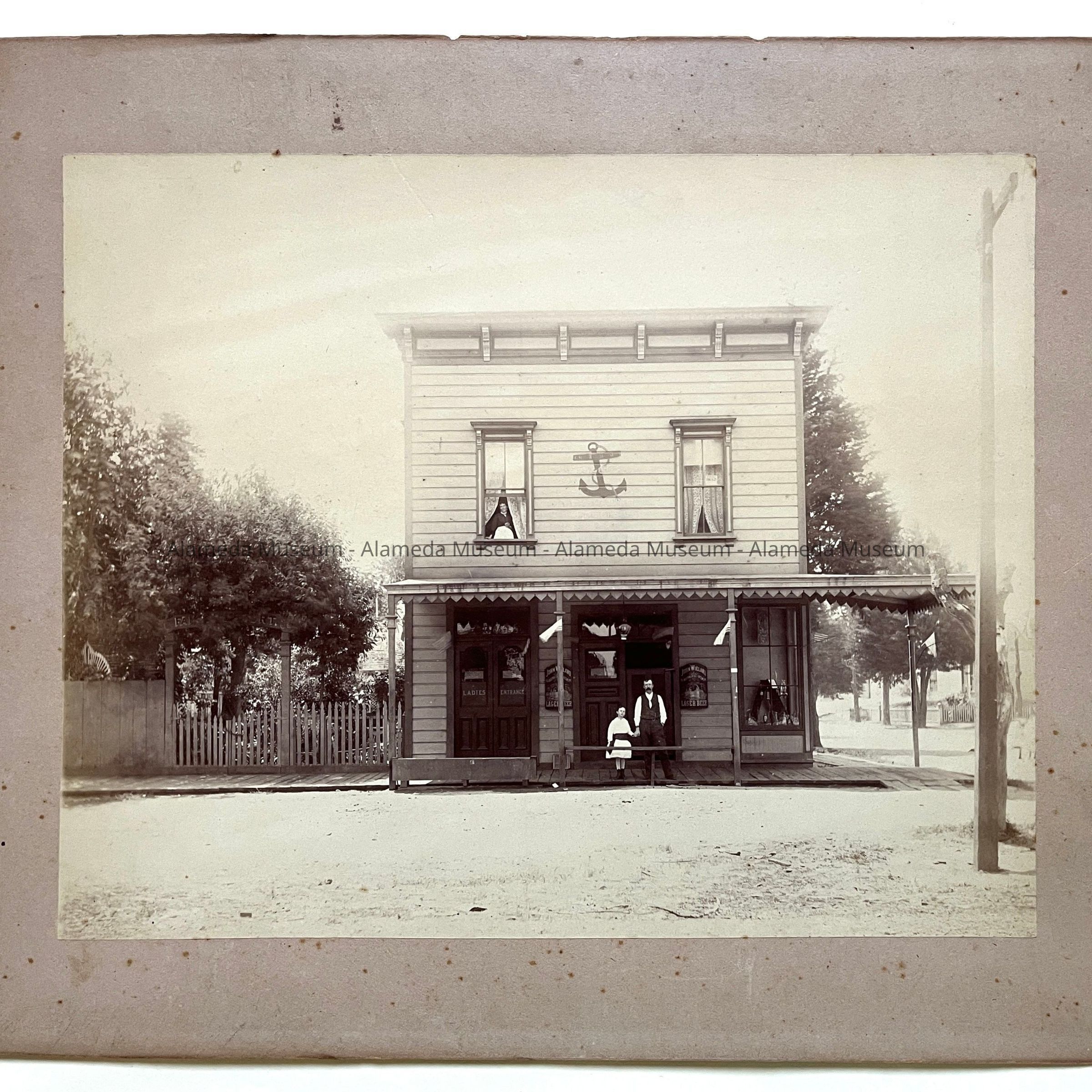 History of Object: View of the Pacific Avenue House, a tavern owned by Conrad Riegelhuth, Sr., who is standing in front of the building with a small child. A woman looking out of a second floor window may be his spouse. This beer garden was located on Pacific Avenue, near Kellogg (now 3rd St.). (See attached notes for further details.)