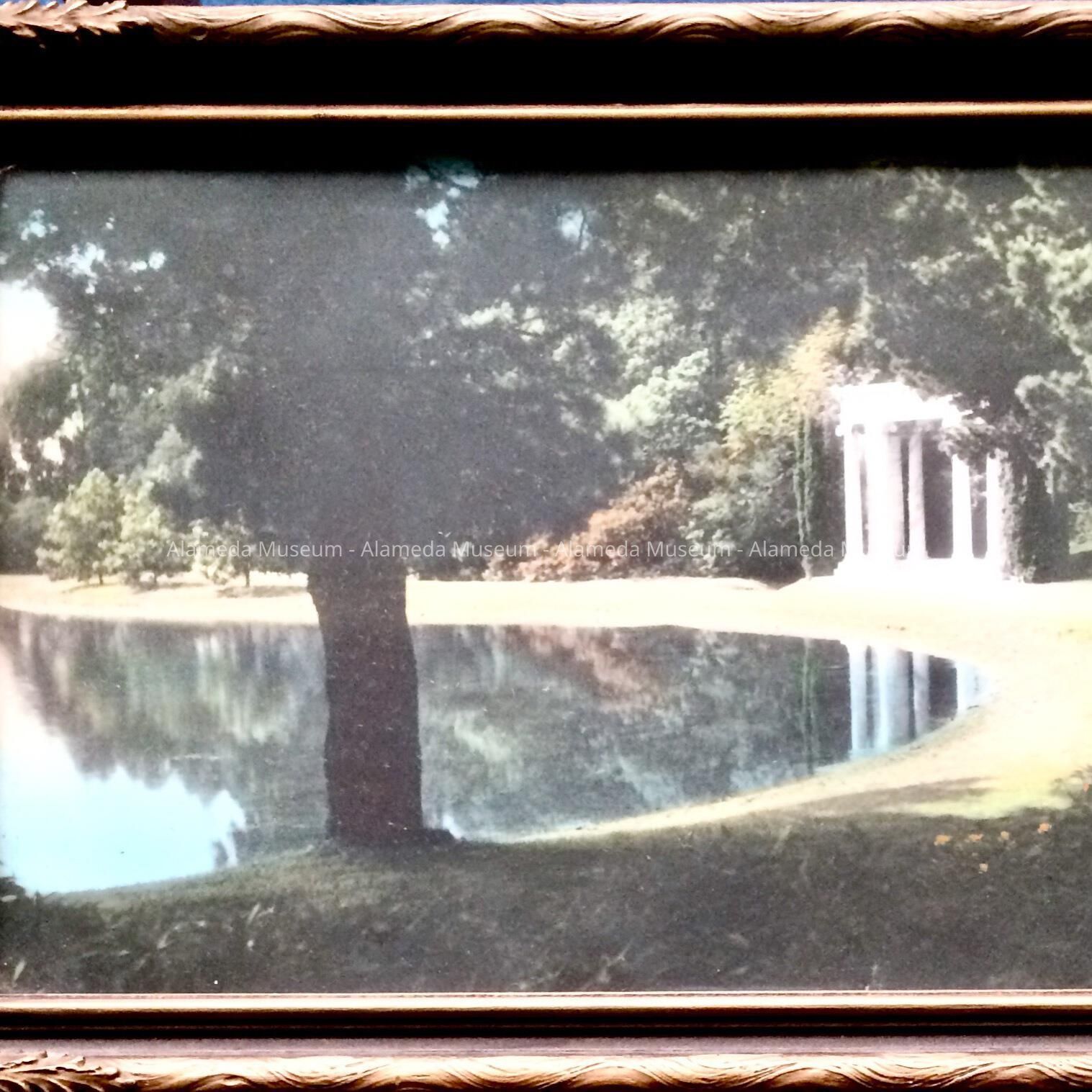 Description: A hand colored photo in a partial gesso frame in antique gold finish. It depicts The Portals of the Past structure in Golden Gate Park. (This structure is the remnant of an entrance portico that belonged to a mansion destroyed by the 1906 SF Earthquake and fire).