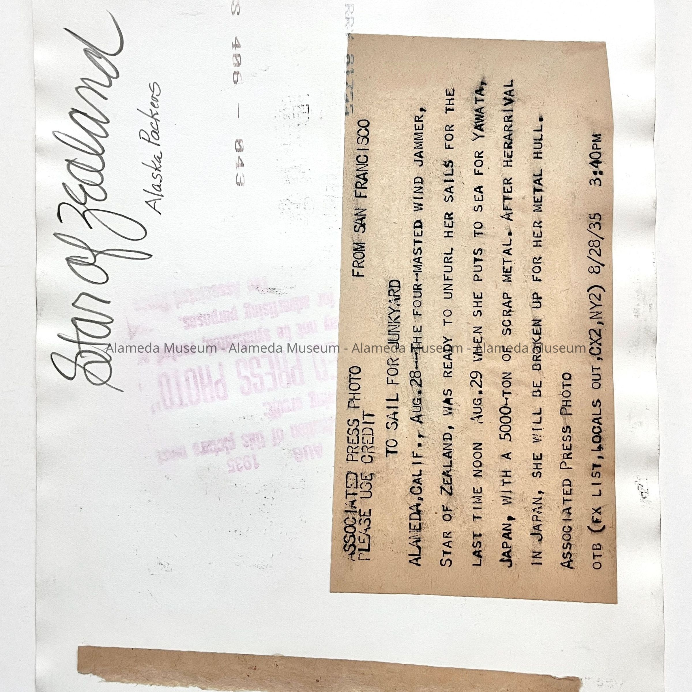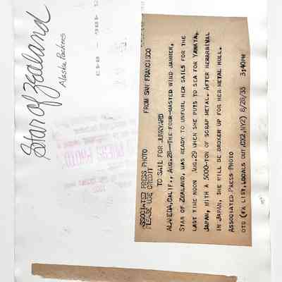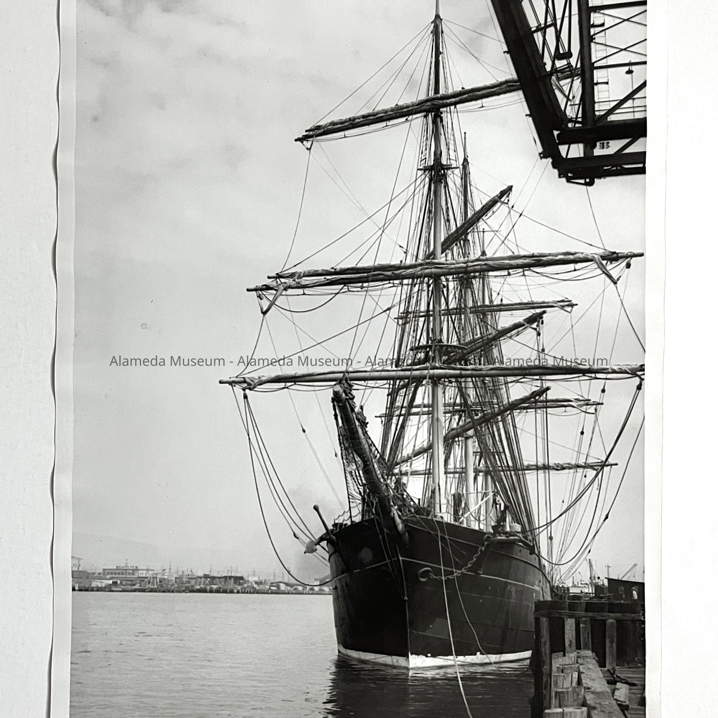 HISTORY OF OBJECT: A PHOTO OF THE "STAR OF ZEALAND" AS SHE PREPARES FOR HER FINAL VOYAGE TO JAPAN, TO BE DISMANTLED FOR SCRAP METAL. SHE WAS PART OF THE ALASKA PACKERS FLEET.