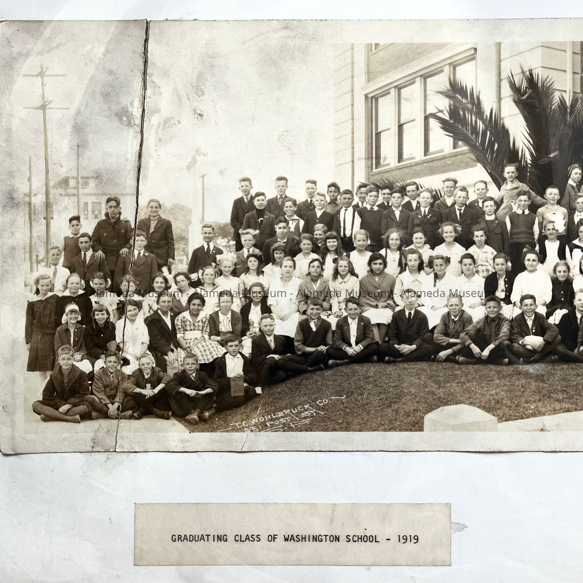 Photographer: T.C. Wohlbruck, 251 Post St., S.F. (per info. incorporated into the negative). The image has a full length vertical tear about 3-in. from the left margin. There are also scuff marks and fingerprints. Two white typewritten identifying labels are affixed to the bottom margin of the mounting. Also, the image is inserted into a case with a transparent plastic cover and tan paperboard backing.