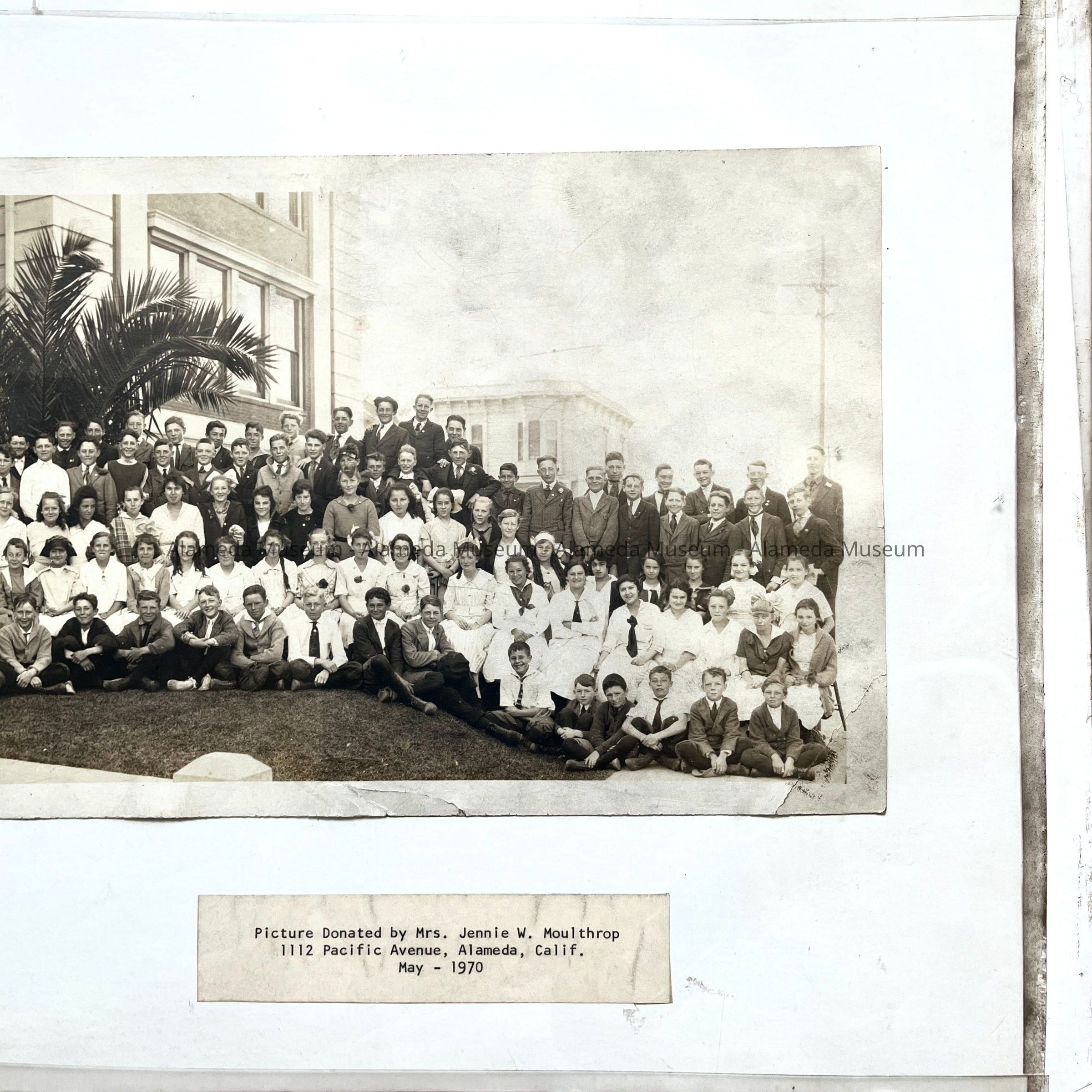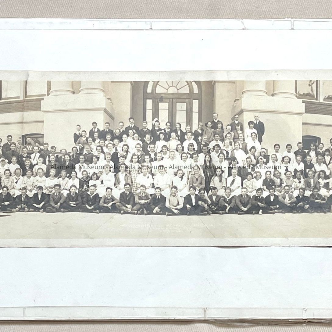 History of Object: Student body and faculty of Washington School posed outside the front entrance. Note that the identifying label states 'Graduating class 1919', but this appears incorrect; there are more students than just the graduating class, and the information on the negative states this was taken May 15, 1918.