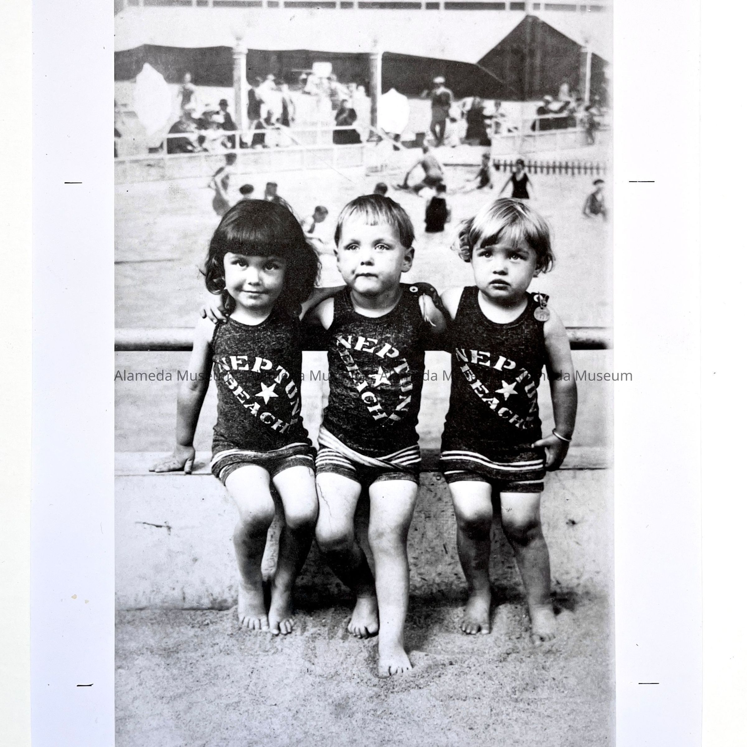 A PHOTO OF THREE UNIDENTIFIED CHILDREN, ATTIRED IN THE OFFICIAL CHILD'S-SIZE NEPTUNE BEACH SWIMSUITS. PHOTO WAS TAKEN AT NEPTUNE BEACH, ALAMEDA, IN THE EARLY 1920's.