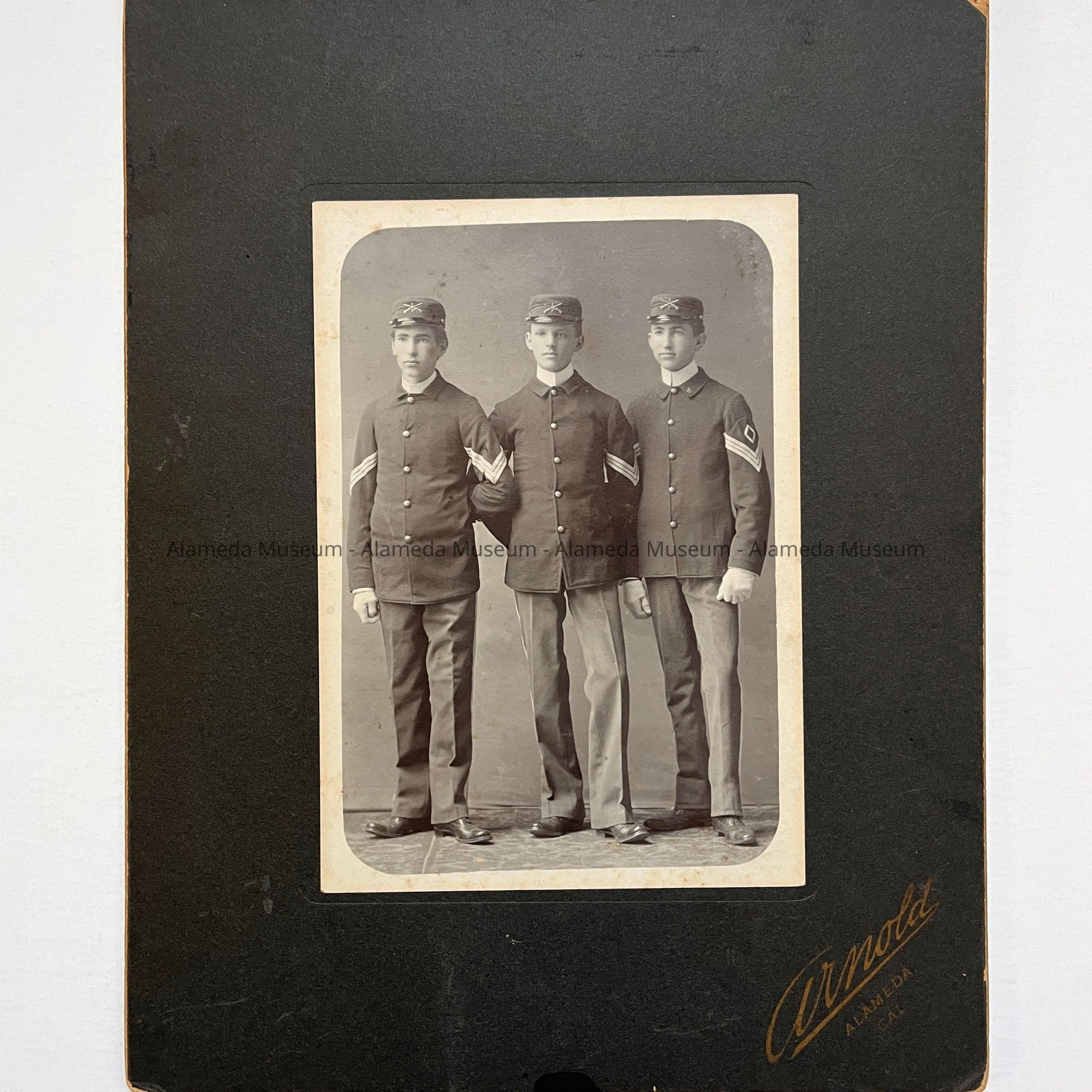 Description: Black/white photo mounted on dk. grey paperboard. Photographer: Arnold, Alameda. Dark 1/2-in stain on bottom edge of mounting. Photographer's name is printed in gold on bottom right edge of the mounting.