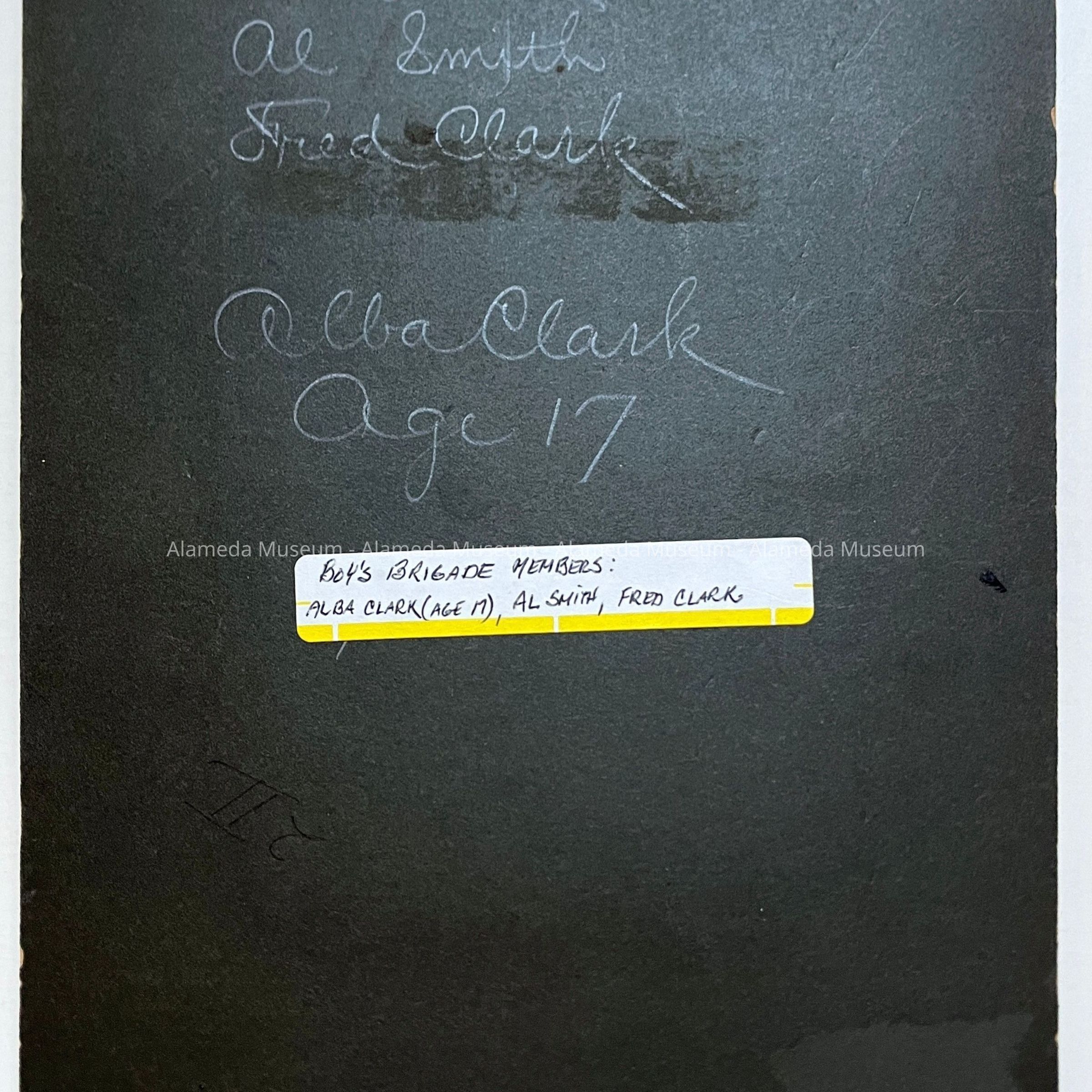 History of Object: Group of three members of the Boys Brigade: Alba Clark (age 17), Al Smith, and Fred Clark, posed in uniform in the studio.