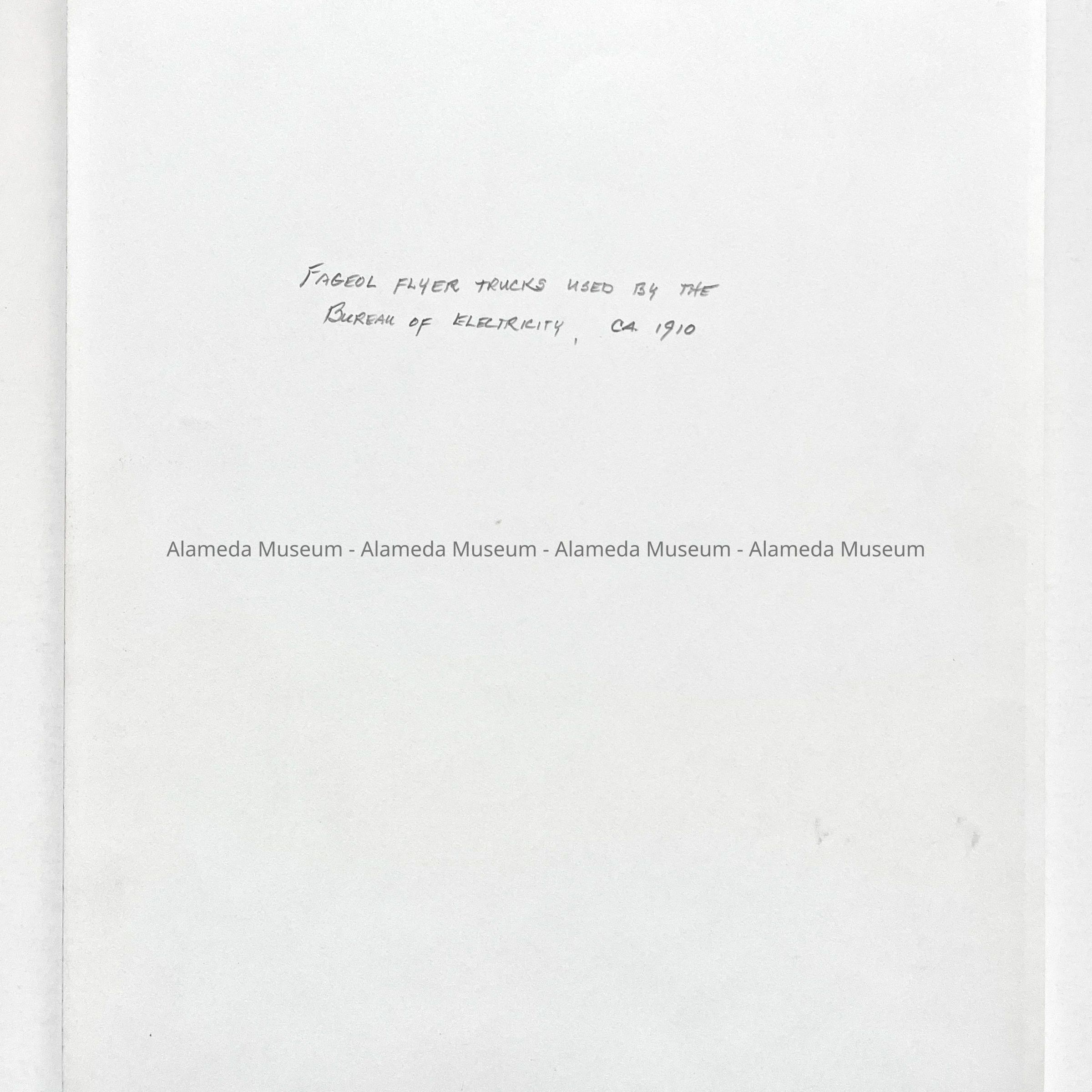 History of Object: Pictures of two "Fageol Flyer" trucks used by the Alameda Bureau of Electricity, ca. 1910.