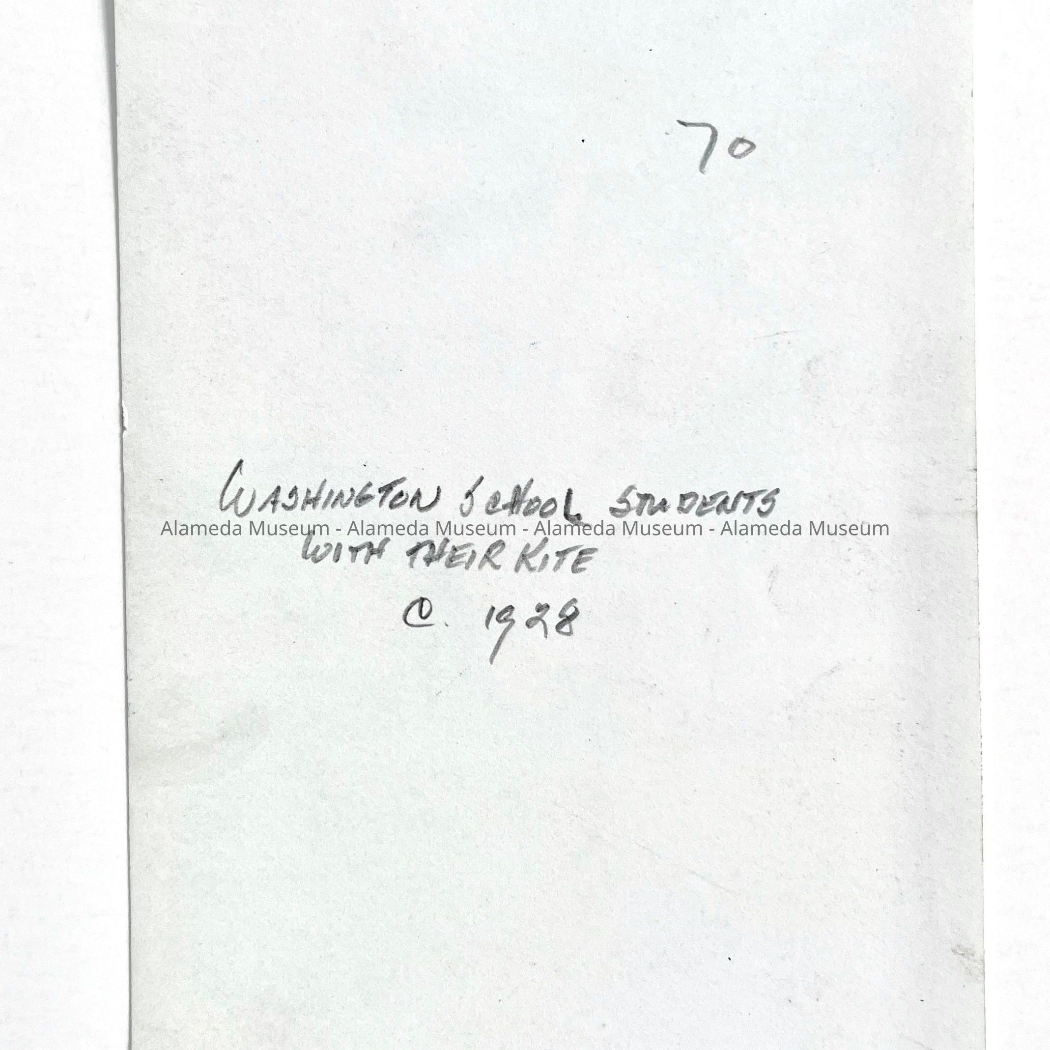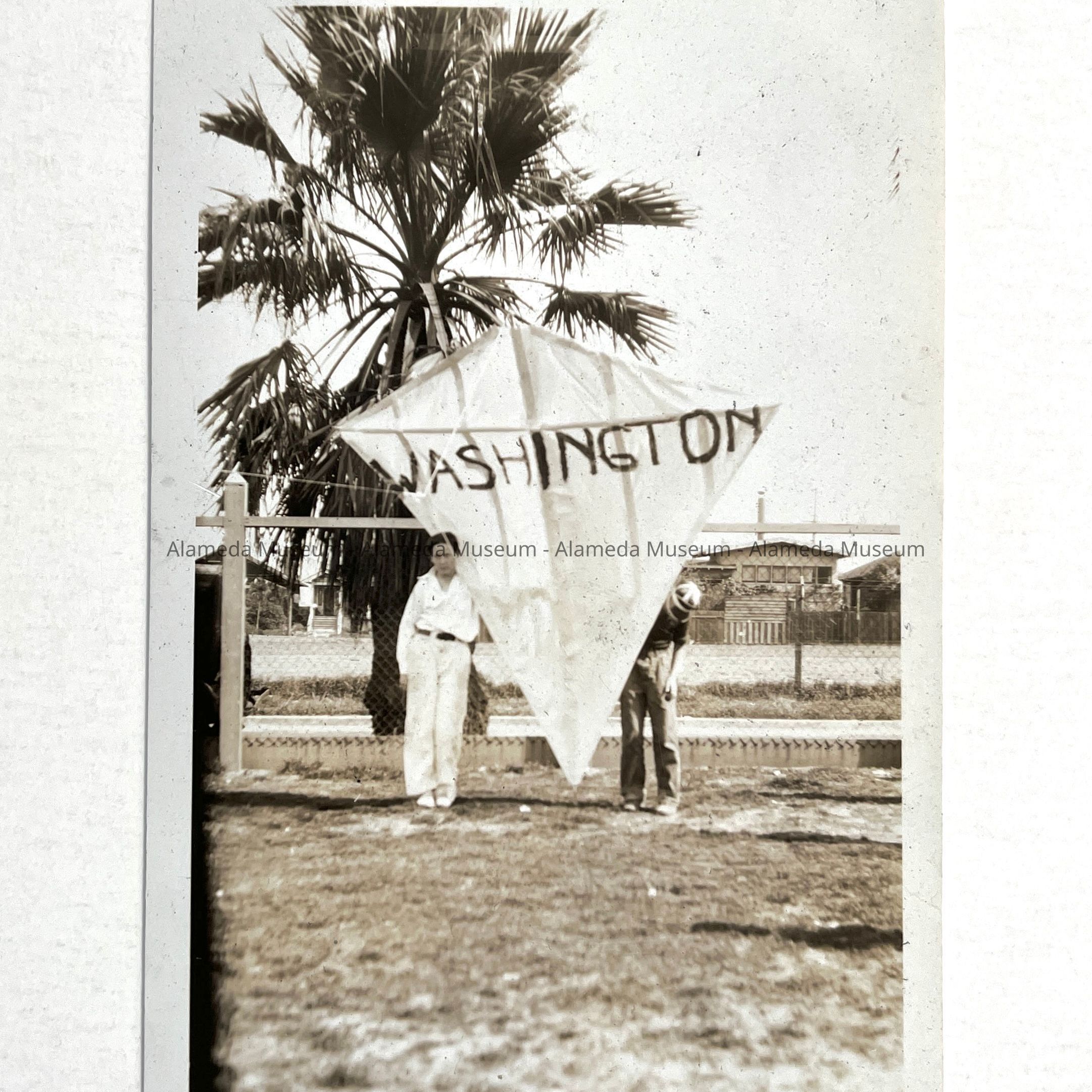 History of Object: Two school boys are posing with their large "Washington" kite.