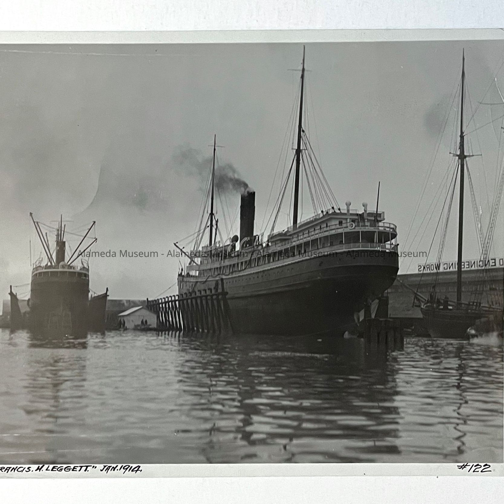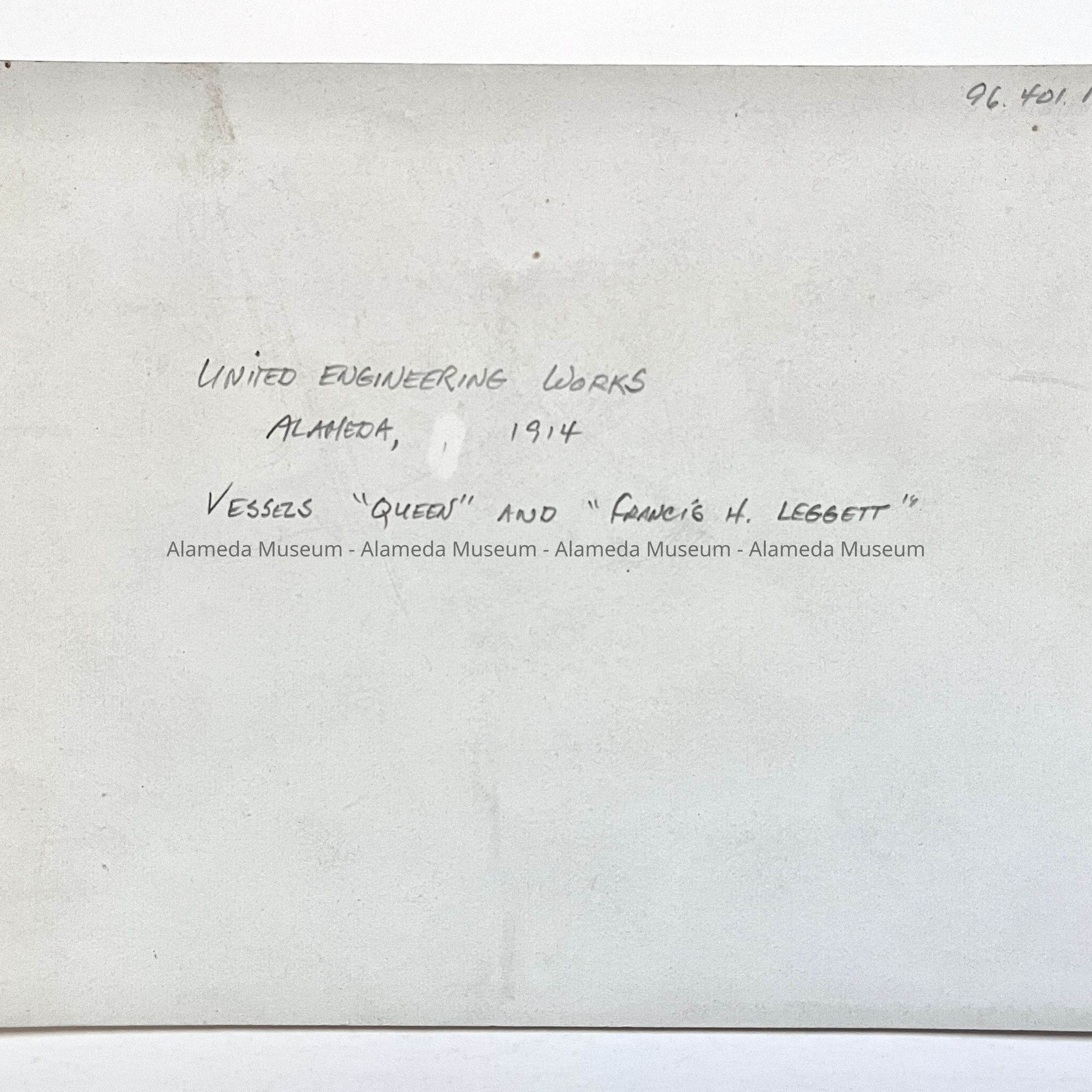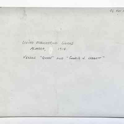 History of Object: Two vessels shown in drydock, January, 1914: "Queen" and "Francis H. Leggett", the latter appears about to sail since smoke is issuing from its funnel.