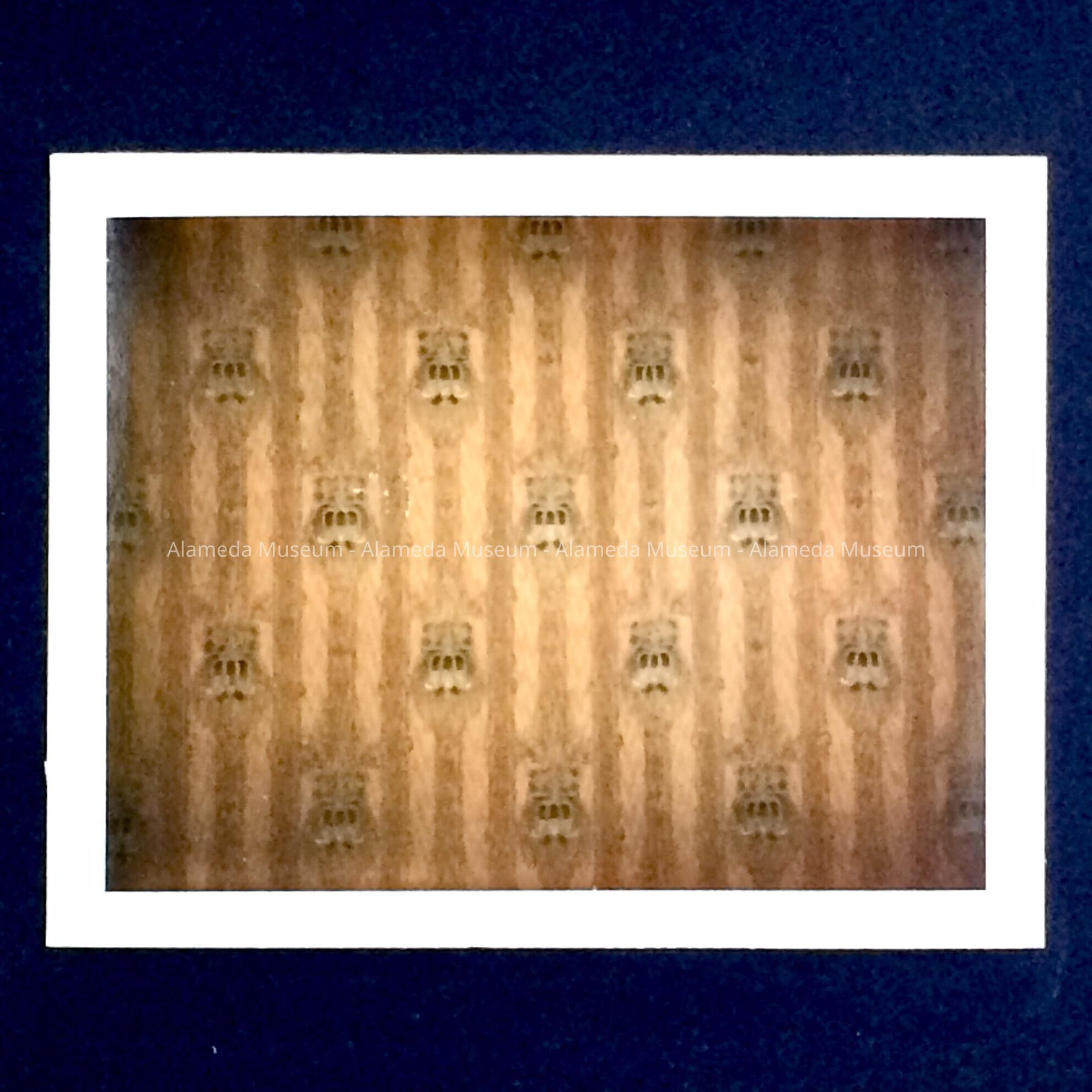 HISTORY OF OBJECT: PHOTOGRAPH OF VICTORIAN WALLPAPER, TAKEN FRIDAY, JULY 18, 1975. BY BOB NELSON, A MEMBER OF THE ALAMEDA VICTORIAN PRESERVATION SOCIETY. THIS IS THE ORIGINAL PAPER (RECEPTION HALL) OF AN ITALIANATE COTTAGE, 1217 OAK STREET, CIRCA 1882-86. THE COTTAGE, ONE OF TWO DEMOLISHED TO MAKE WAY FOR THE NEW ALAMEDA HIGH SCHOOL. THE COTTAGE WAS TO BE SPARED, BUT UNFORTUNATELY THE CAMPAIGN TO SAVE THEM WAS TO LATE. THIS VIVID SAMPLE OF PAPER WAS EXPOSED AFTER THE OWNER REMOVED A (CABINET OR MIRROR?) THAT HAD BEEN AFFIXED TO THE WALL OF THE HALL FOR MANY YEARS.