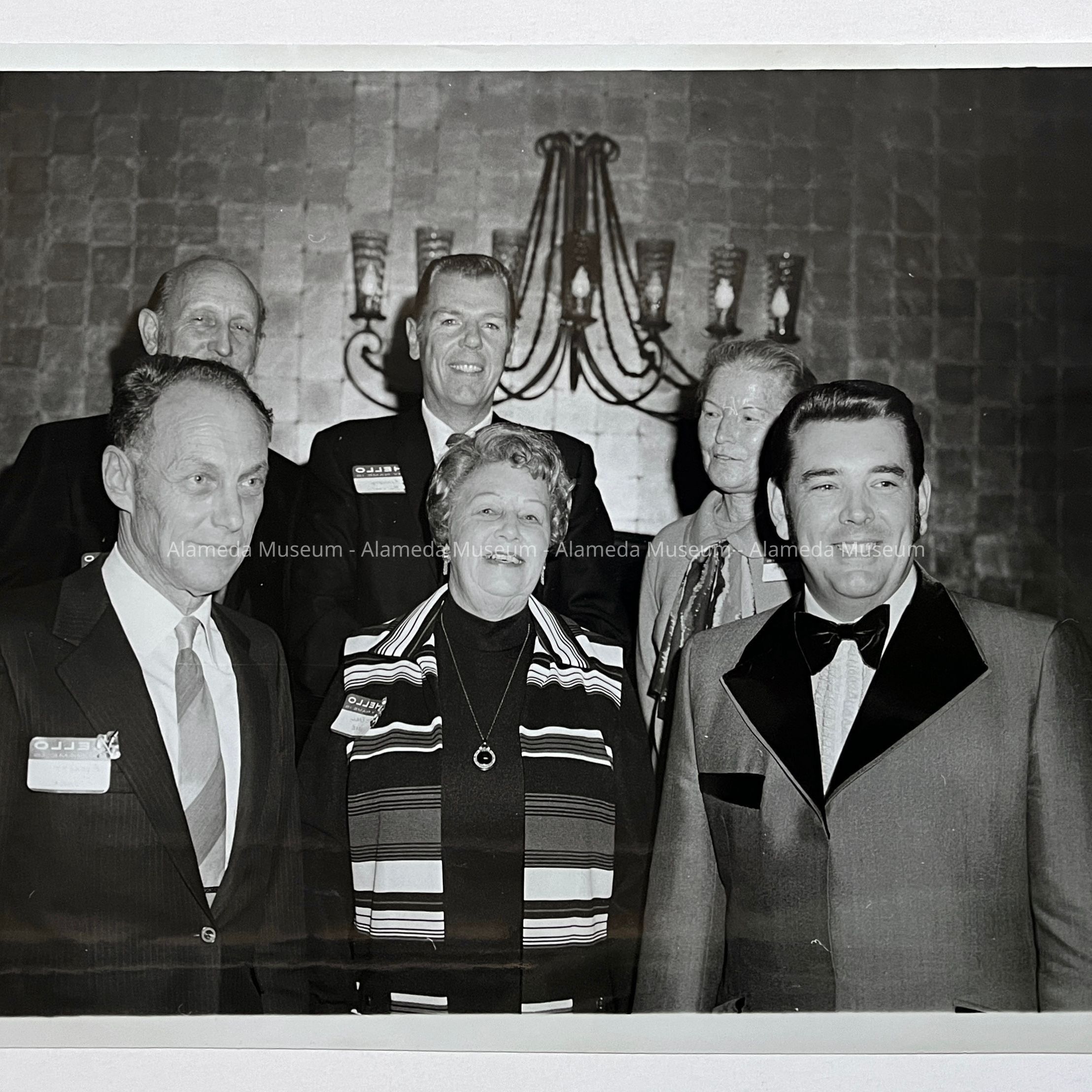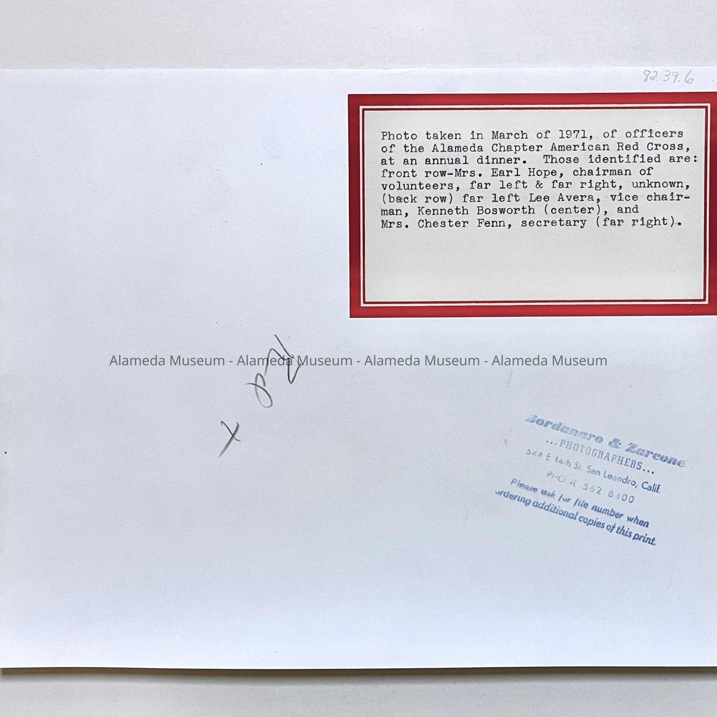 History of Object: Photo taken in March, of 1971, of officers of the Alameda Chapter American Red Cross, taken at an annual dinner. Those identified are: front row-Mrs. Earl Hope, chairman of volunteers, far left & far right, unknown, (back row) far left Lee Avera, vice chairman, Kenneth Bosworth (center), and Mrs. Chester Fenn, secretary (far right).