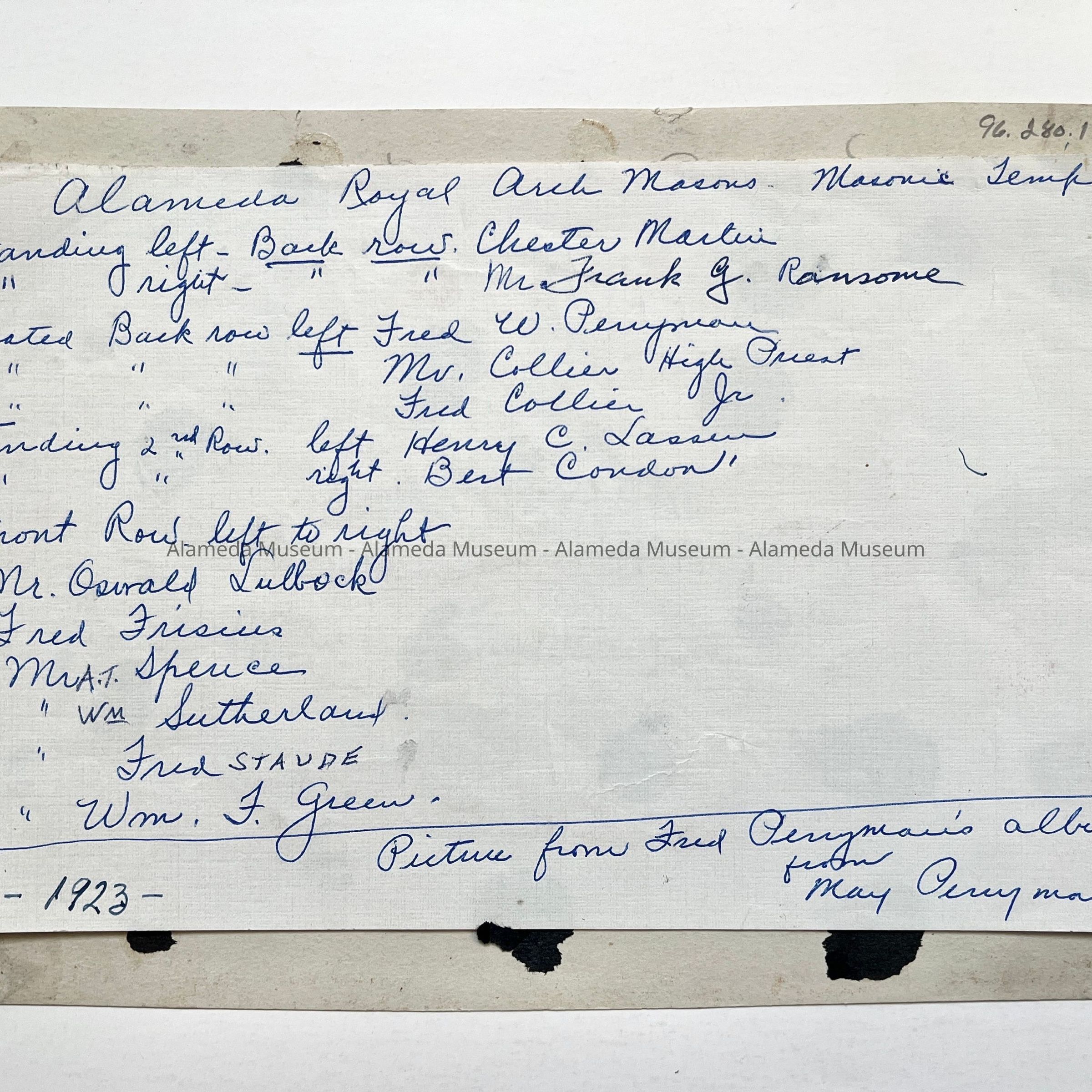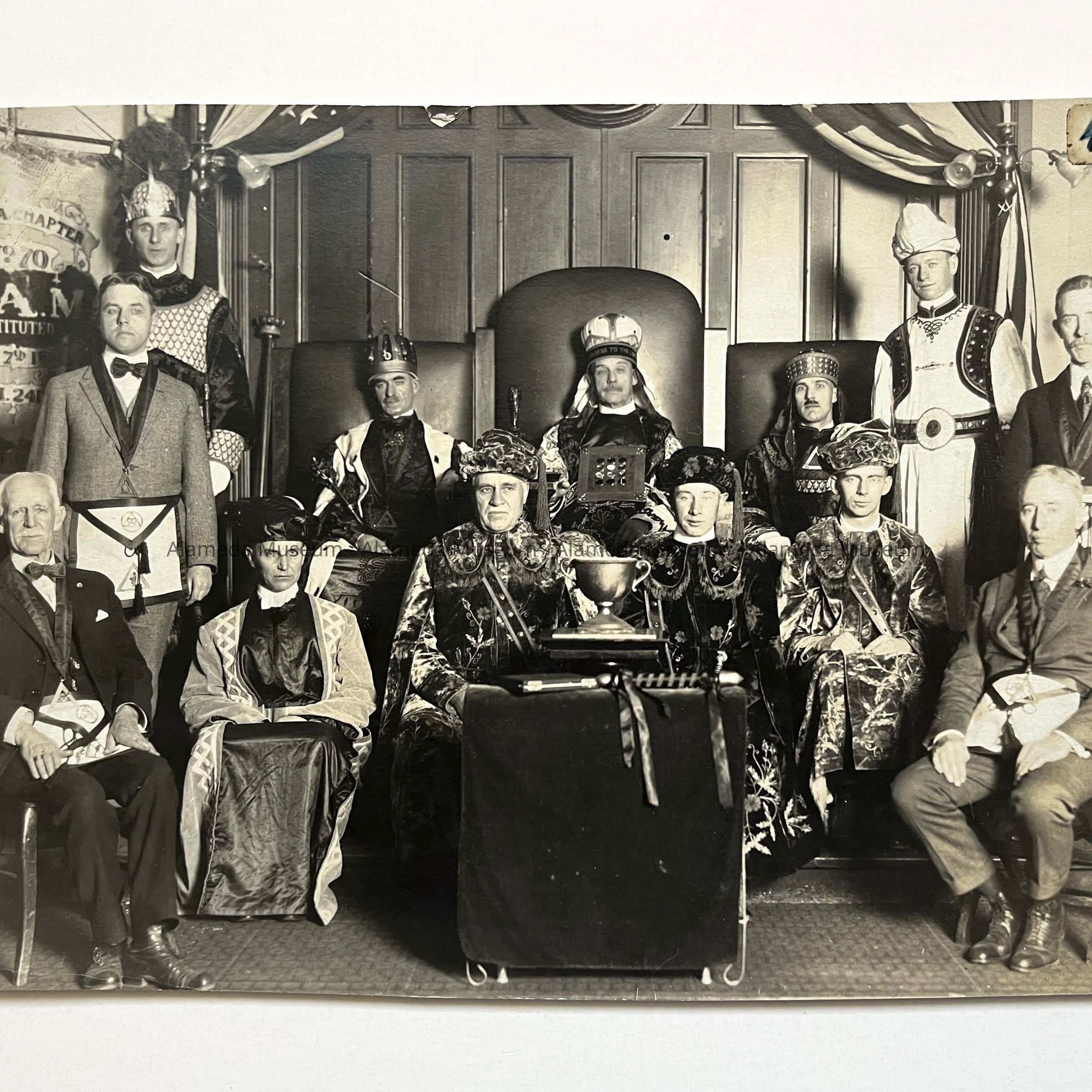 History of Object: Officers of Alameda Chapter #70, Royal Arch Masons, posed in full regalia. The participants are identified on verso per an attached list.