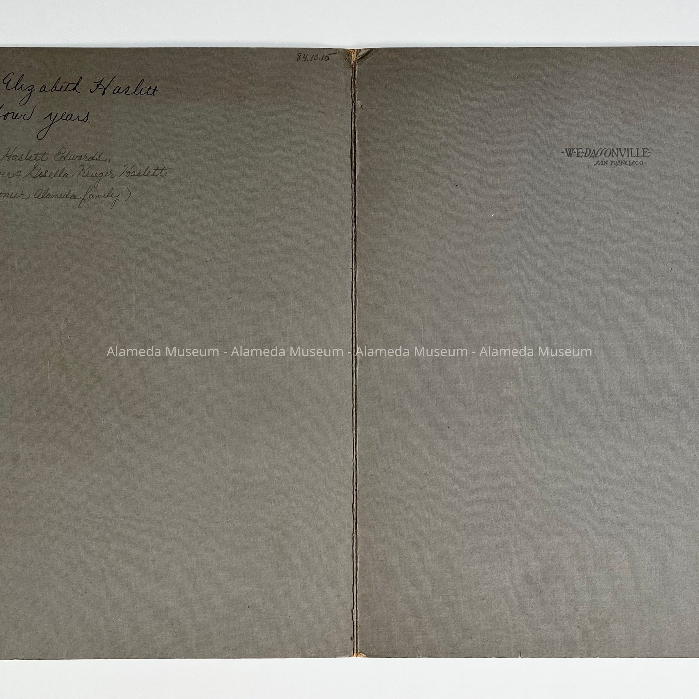 DESCRIPTION: Black and white photograph, mat finish, in booklet cover of grey paper, signed on cover "W. E. Dassonville San Francisco".