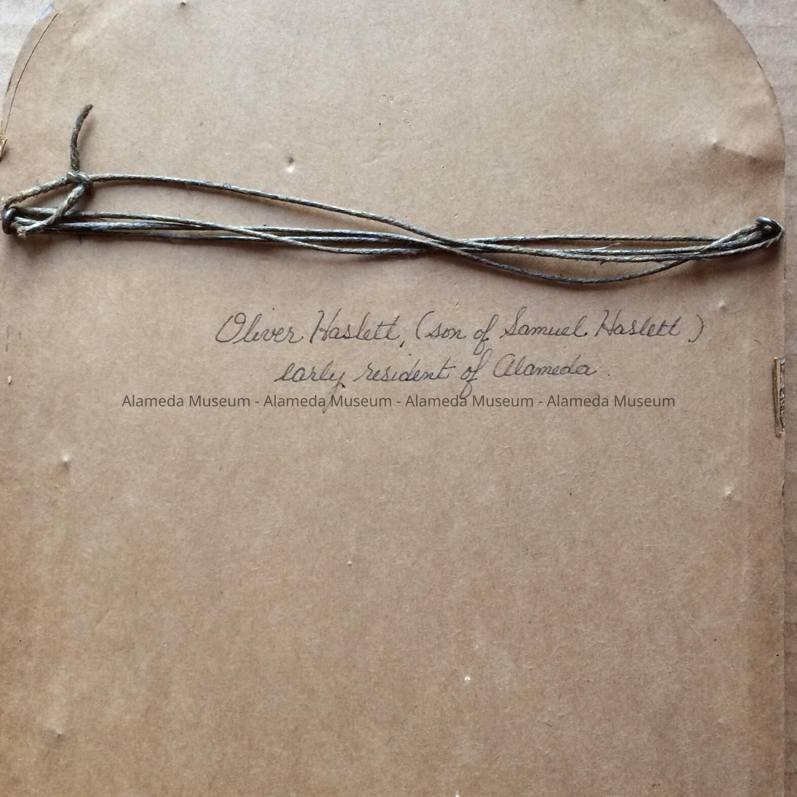 History of Object: Framed photo of Oliver Haslett (original owner of the high-wheel bike in the museum collection), member of a prominent old time Alameda family. He was the son of Samuel Haslett, and brother of Samuel M. Haslett (1605 Clinton).