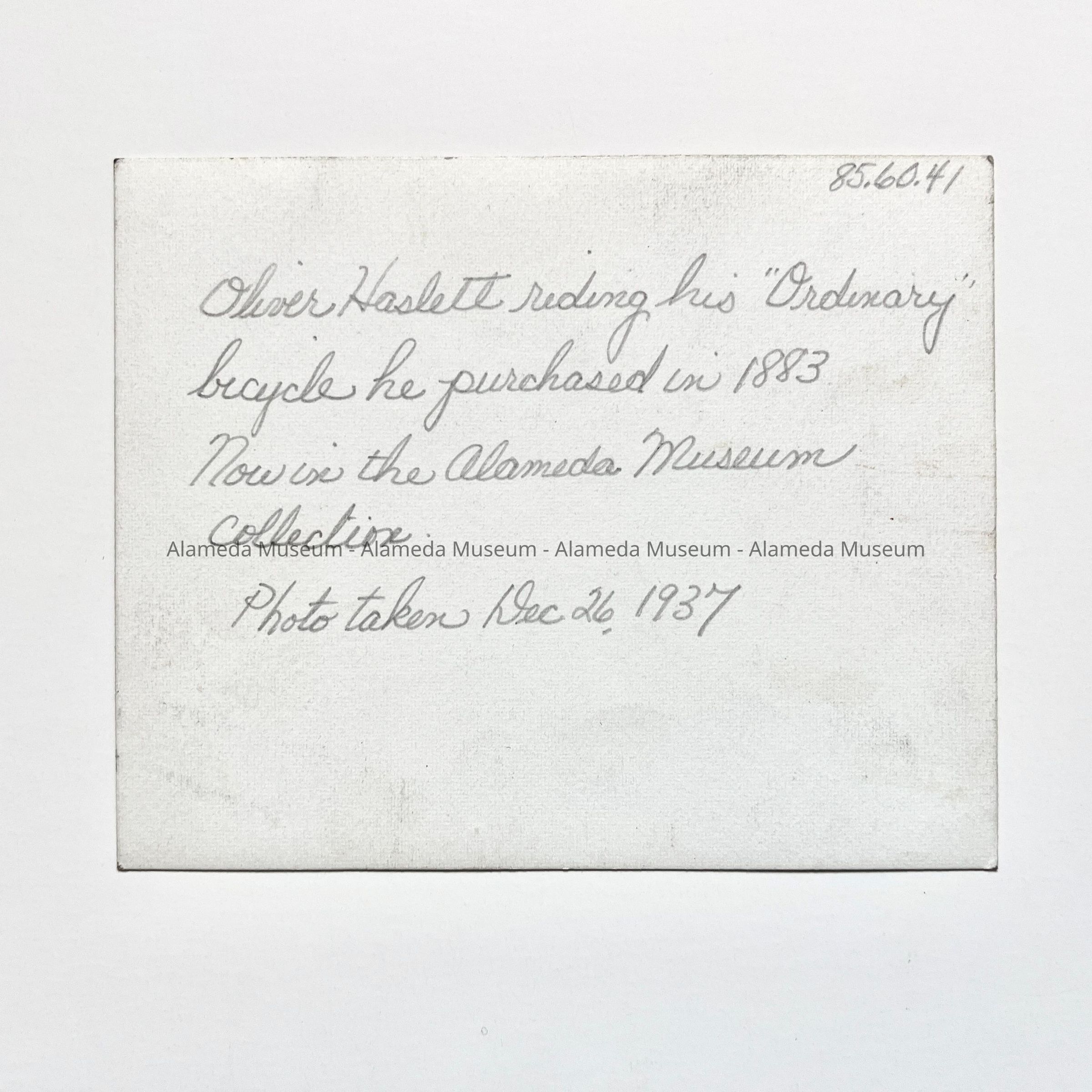 History of Object: Photo of Oliver Haslett riding his "Ordinary" bicycle he purchased in 1883. Now in the Alameda Museum collection. Photo taken Dec. 26, 1937.