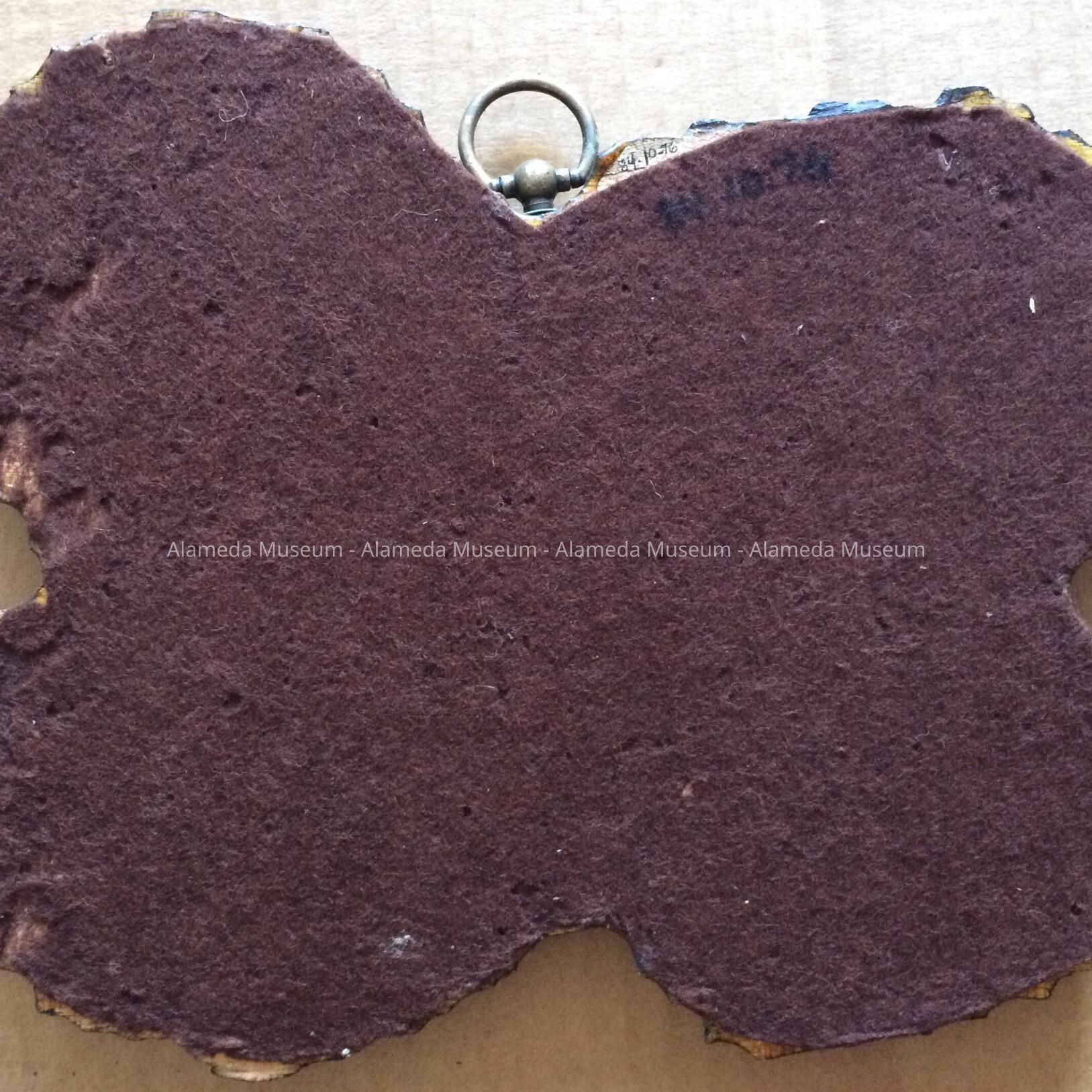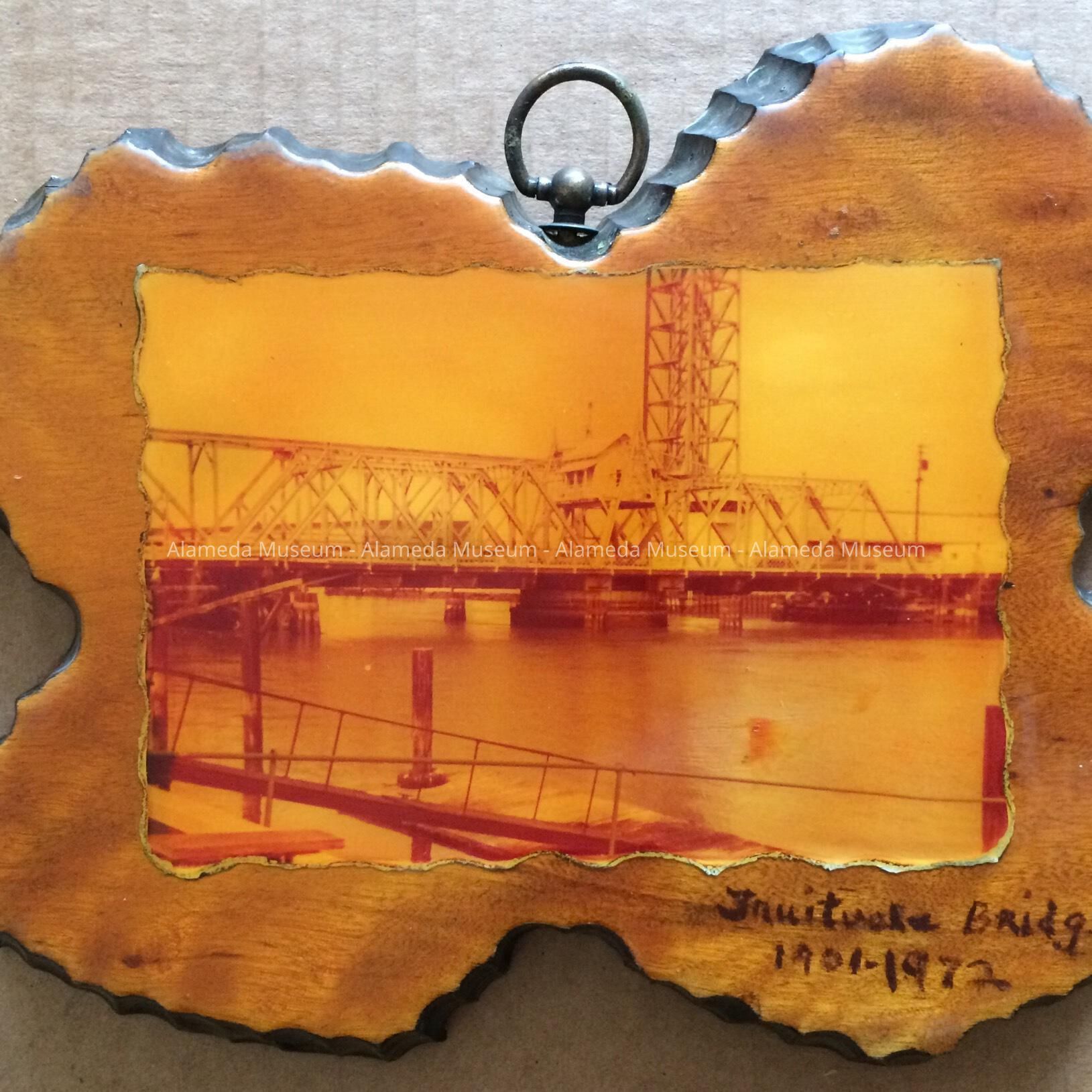 Wooden plaque with scalloped edges upon which has been glued a colored photograph, plastic finished. The reverse side is covered with brown colored felt. A crude caption in script states "Fruitvale Bridge 1901-1972, in written on the lower right hand corner, below the photograph.