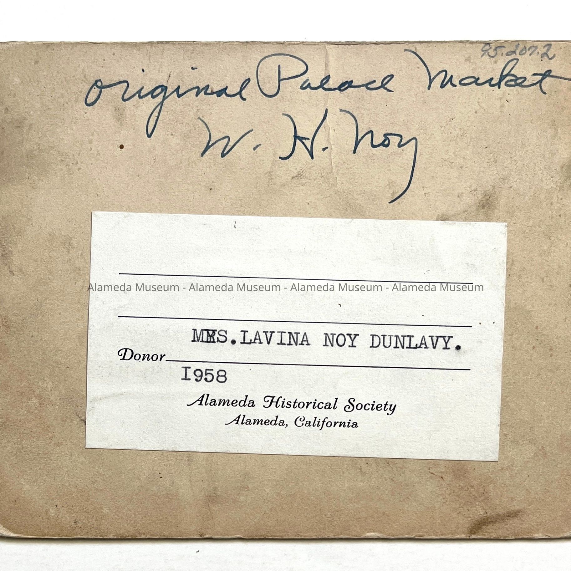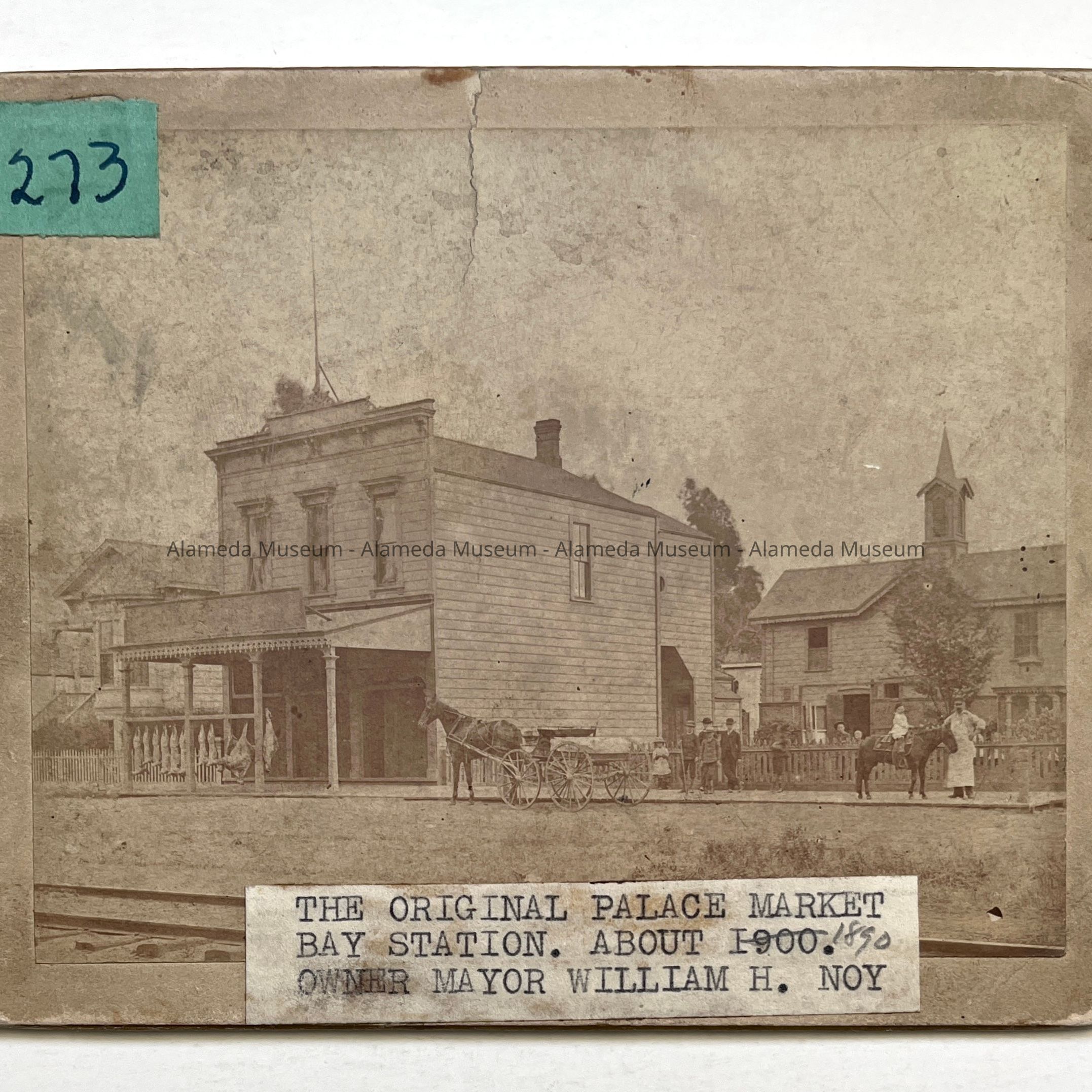 History of Object: Interesting street view of the original Palace Market located in the Bay Station district. Two story frame building with a porch extension over the sidewalk to the street edge, has assorted animal carcasses attached to the streetside railing. Owned by Mayor W. H. Noy.