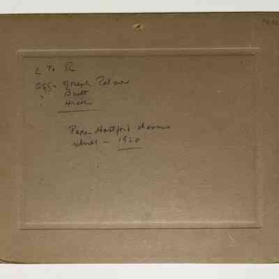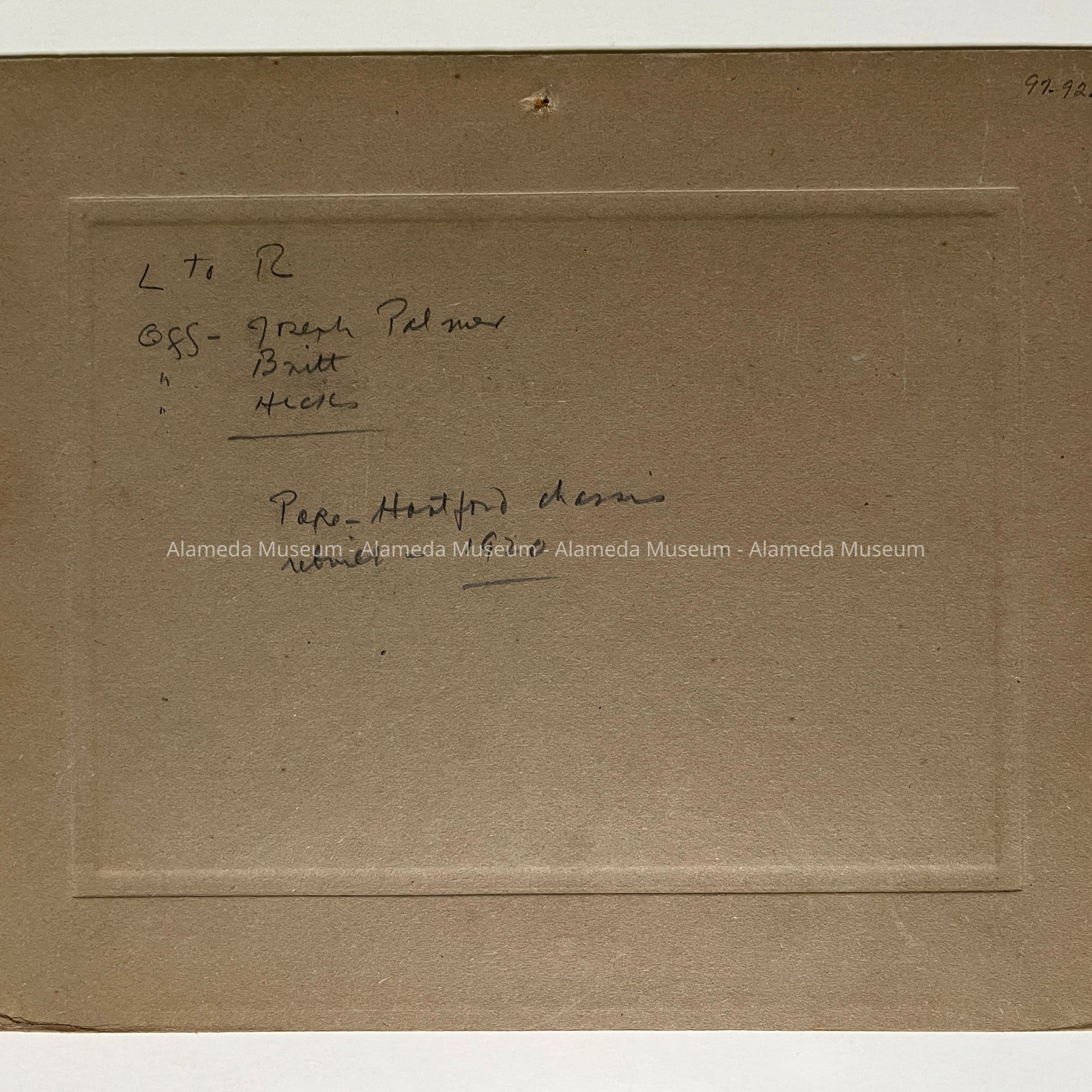 Description: Sepia-toned black/whitephoto mounted on dk. grey paperboard on which black borders are imprinted around the image and also along the outer edges. The mounting has a nail hole at center top and an old green cataloging label at the upper left corner.