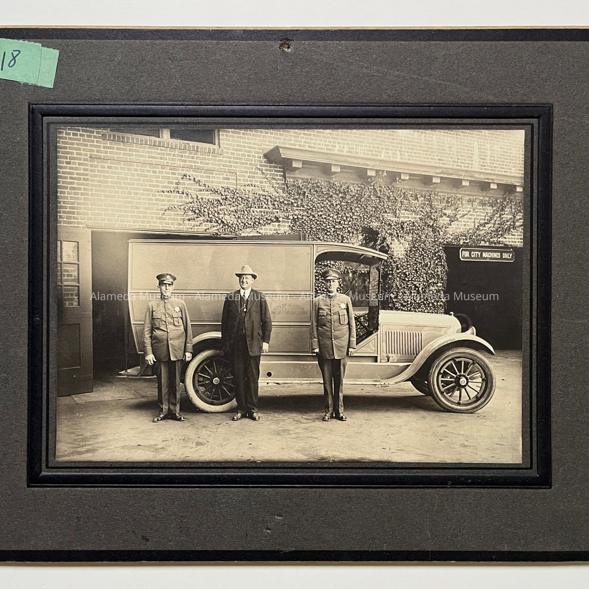 History of Object: View of the Pope-Hartford police wagon/ambulance, which was rebuilt in 1920. The Police officers are identified on verso.