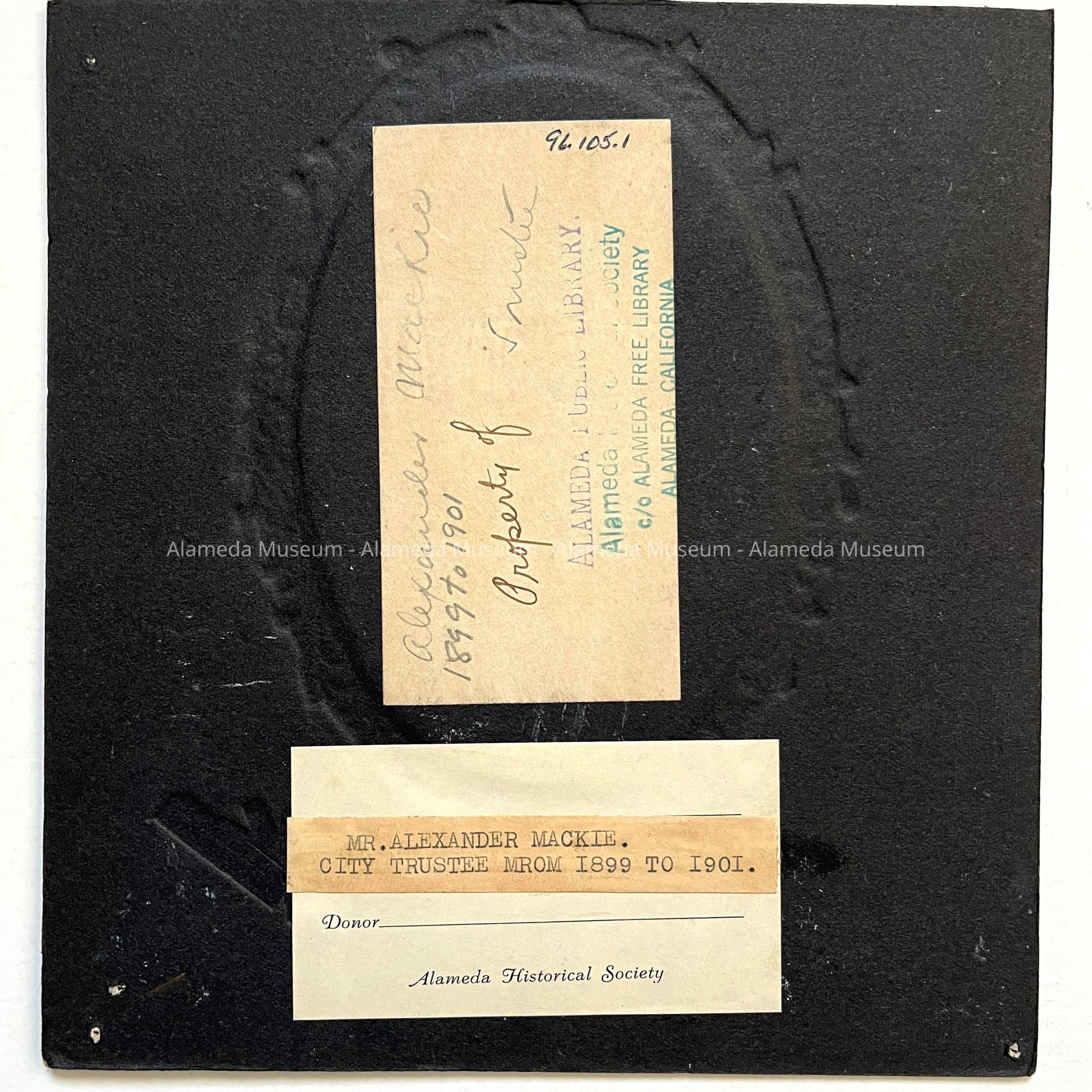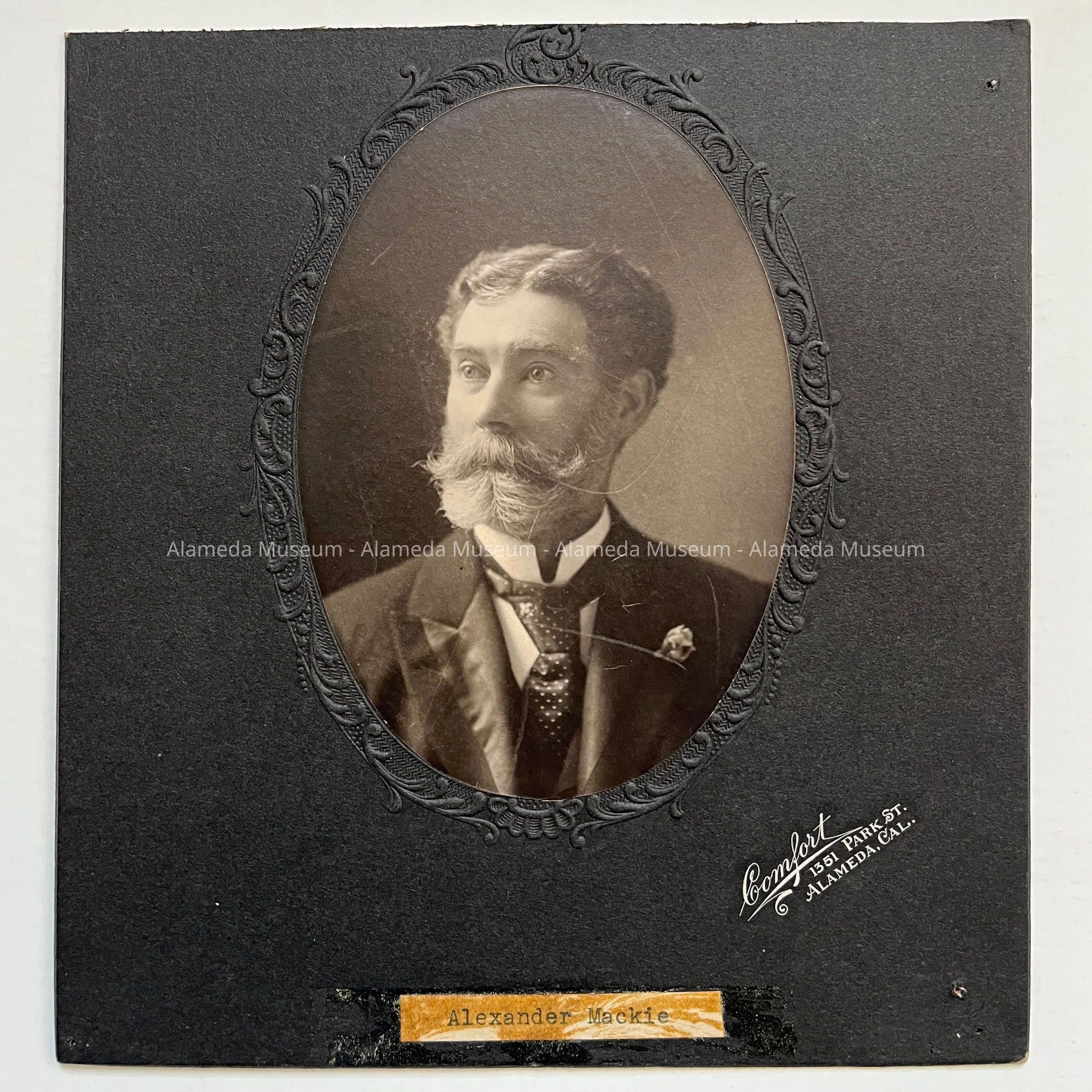 History of Object: Portrait of Alexander Mackie, a City Trustee from 1899-1901. He resided at 2033 San Antonio Avenue, according to the 1912 Alameda City Directory.