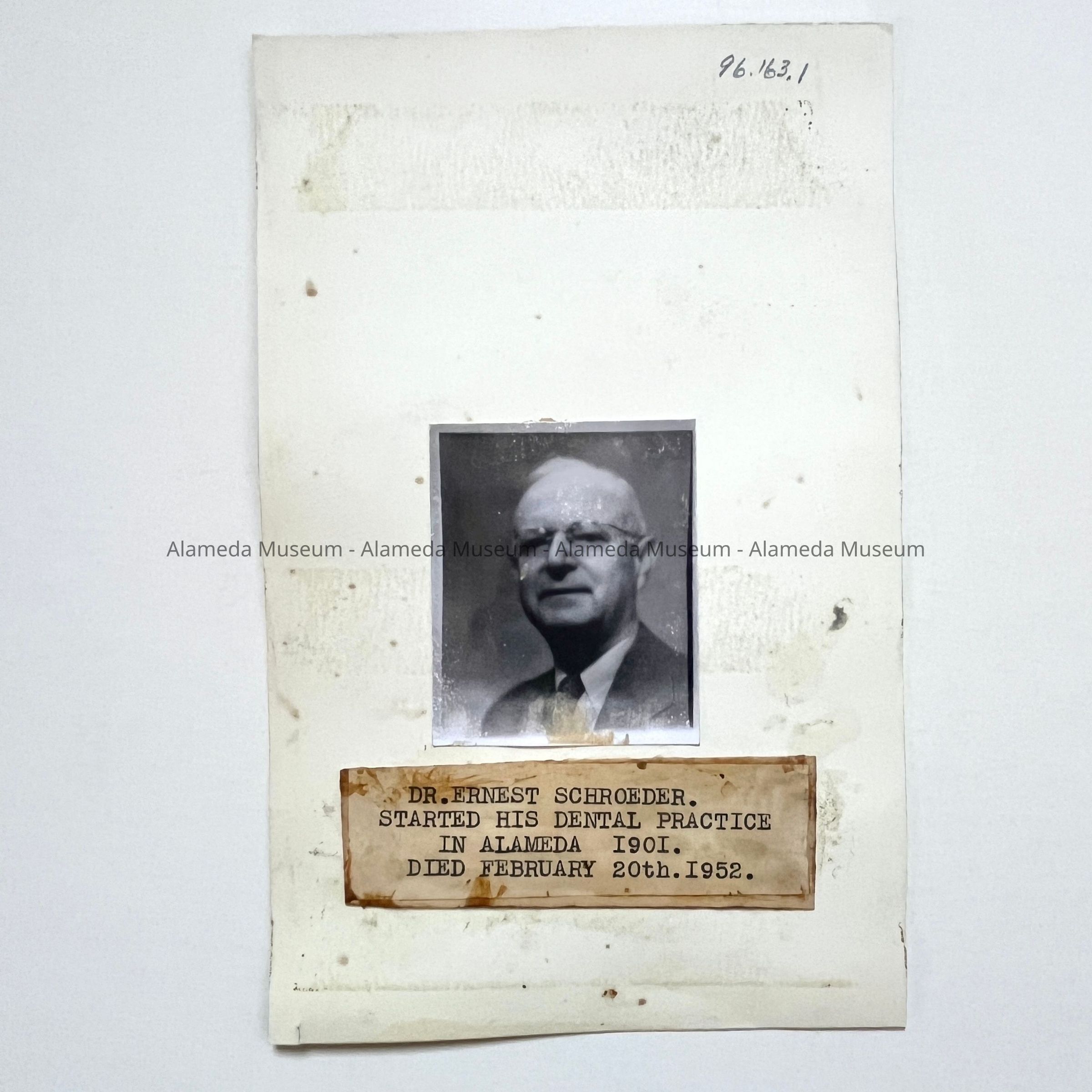 History of Object: Portrait of Dr. Ernest R. Schroeder, a dentist who began his practice in Alameda in 1901, and who died in 1952. His office was at 2328 Santa Clara Ave. and his residence at 2158 Santa Clara Ave.