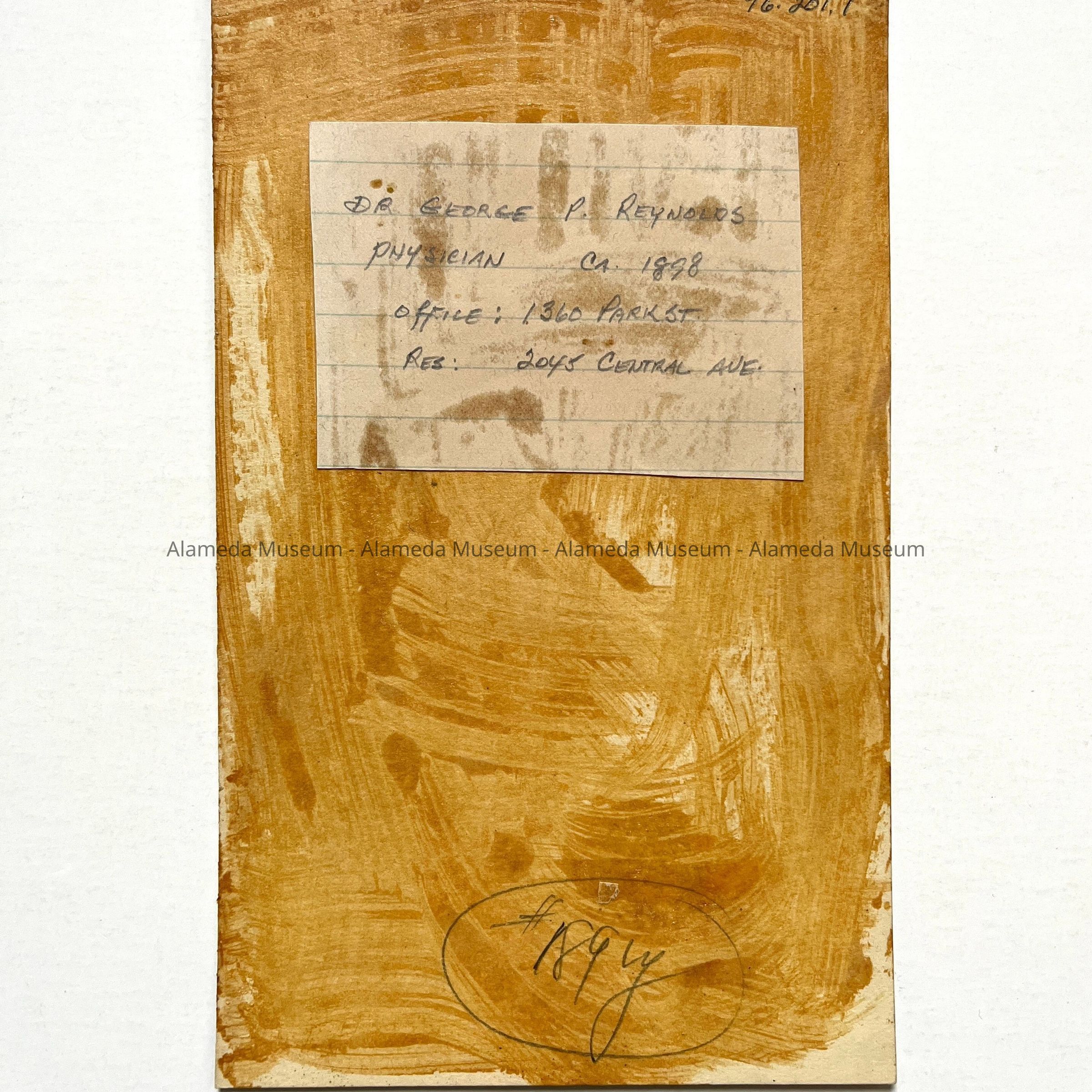 History of Object: Portrait of Dr. George P. Reynolds, physician, who practiced at 1360 Park St., and who resided at 2045 Central Avenue. Image is similar to the larger image of Acc. No. 96.200.1, except in finish color.
