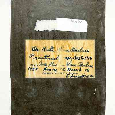 Description: Sepia-toned photo mounted on black paperboard. Photographer: Gertrude Cockroft of Alameda. Image damaged by (1) glue penetration and (2) a segment of missing emulsion (abt. L-1 x W-1 1/4 in.) pulled off by Scotch tape near lower third of the image. A typed description label is affixed to the lower margin of the mounting.