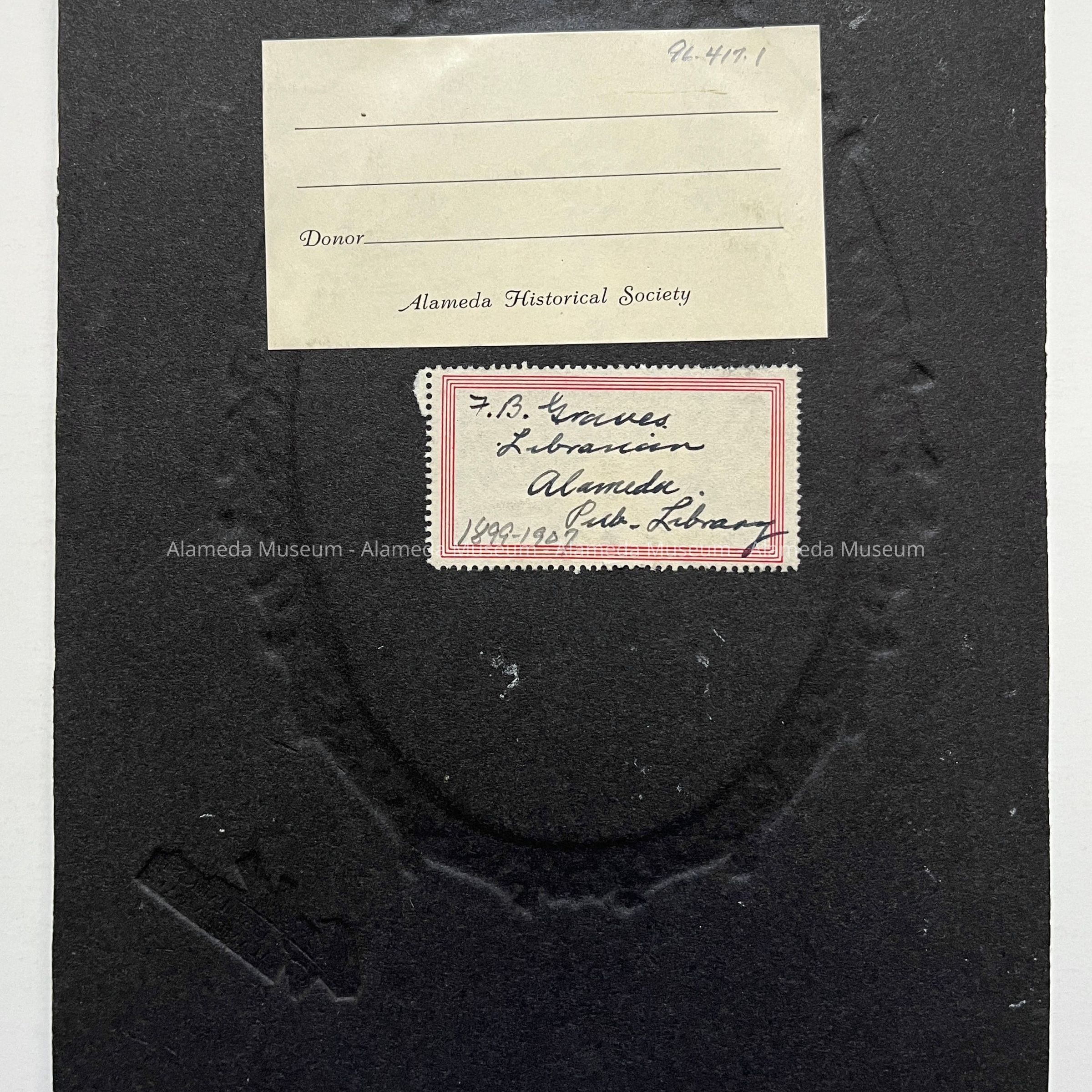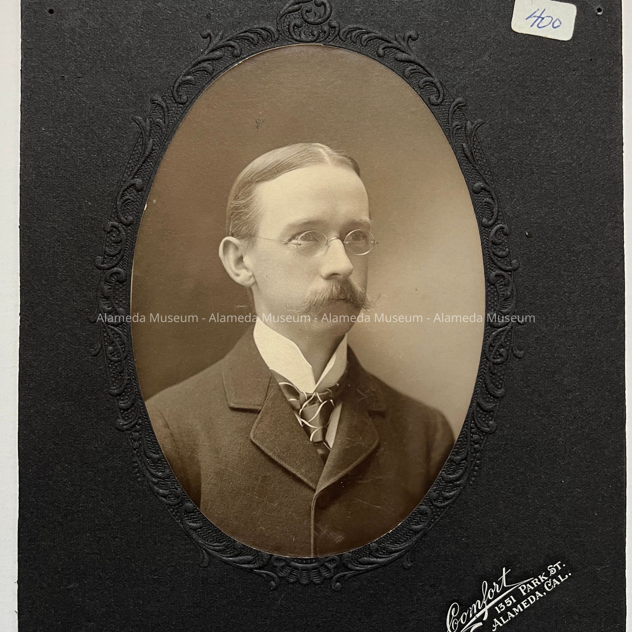 Description: Sepia-toned oval photo, mounted on charcoal paperboard. Photographer: Comfort, Alameda, whose name is imprinted in white on the lower right corner of the mounting, An old cataloging label and a typed description label - both in white - are affixed to the upper right and the bottom center edges, respectively, of the mounting.
