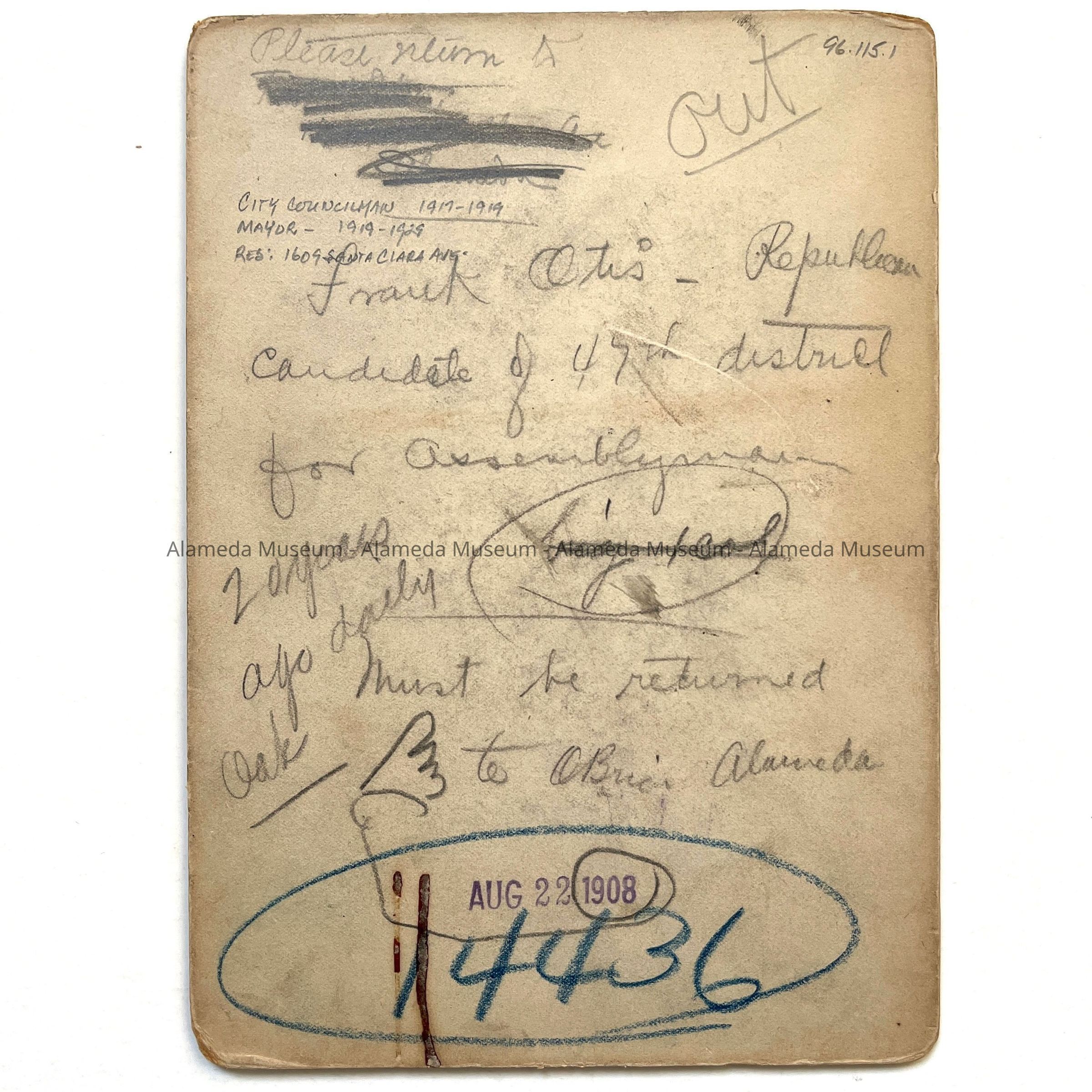 History of Object: Portrait of Frank Otis around the time he was the Republican candidate for the 47th Assembly District. He later served on the City Council (1917: - 1919), and was Mayor from 1919 to 1929. An attorney, he resided at 1609 Santa Clara Ave., Alameda.