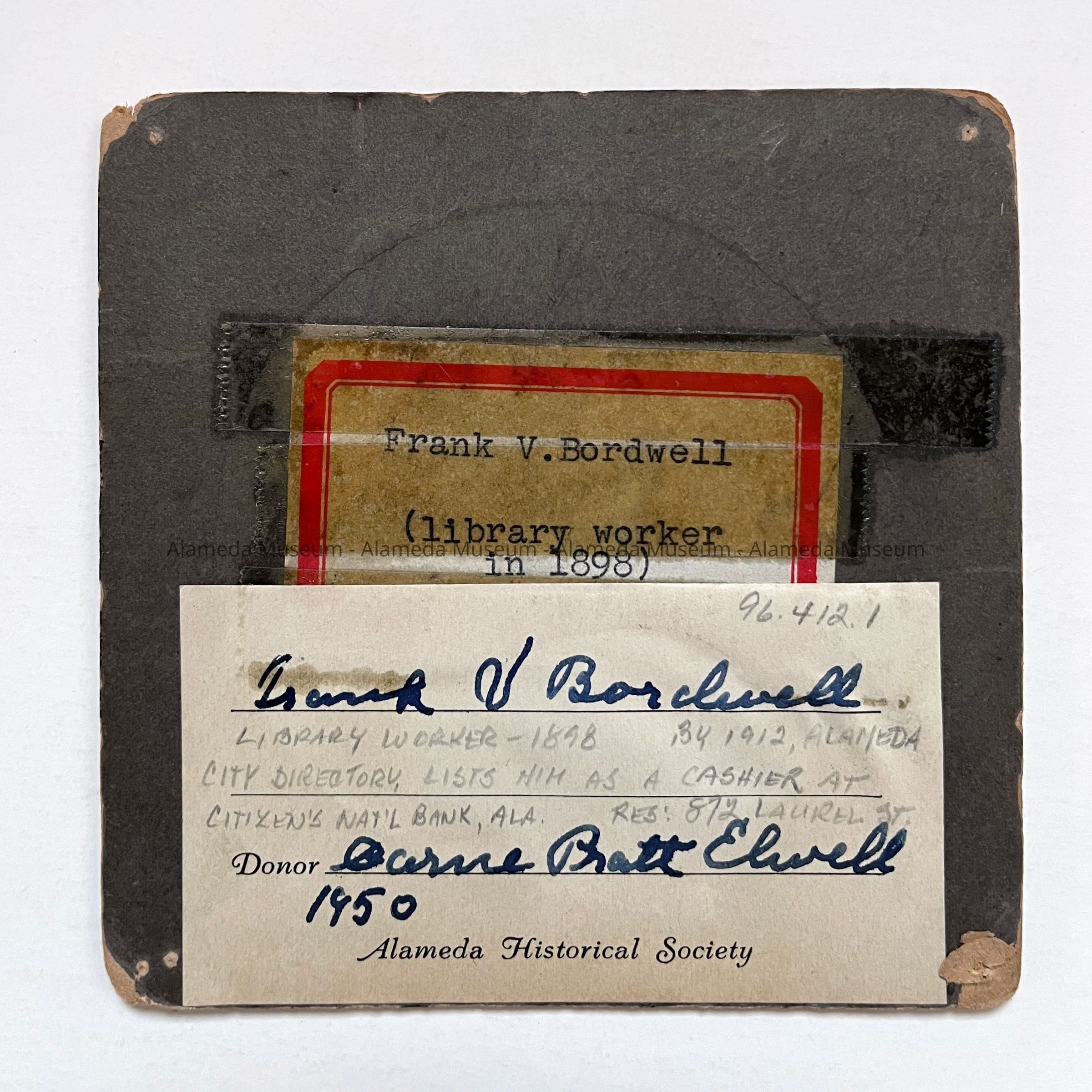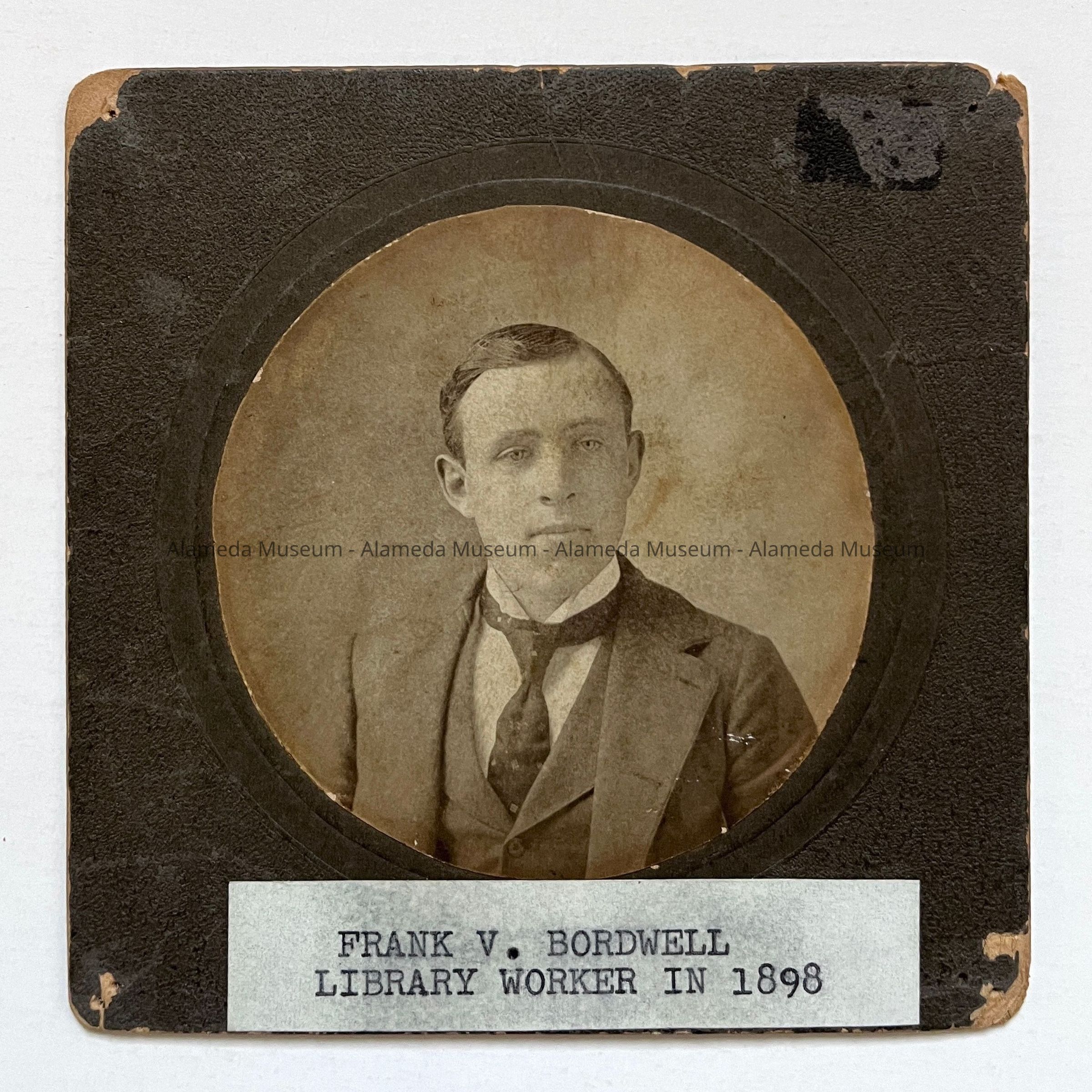 History of Object: Portrait of Frank V. Bordwell, a Library worker in 1898. In 1912, according to the Alameda City Directory, he was a cashier at the citizens National Bank in Alameda, and he resided at 872 Laurel Street, Alameda. (See Acc. No. 96.413.1 for another photograph of Mr. Bordwell.)