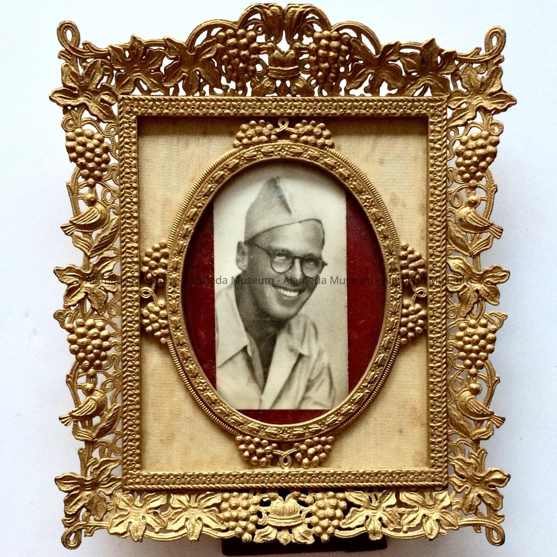 PHOTOGRAPHIC PORTRAIT OF FRED W KRUEGER, FATHER OF THE DONOR, IN ARMY UNIFORM. HE WAS BORN ON MAY 19, 1916 IN CHICAGO, IL. HE EARNED THE RANK OF TECHNICIAN-5 PRIOR TO HIS HONORABLE DISCHARGE FROM THE UNITED STATES ARMY ON AUGUST 29, 1945. THE KRUEGER FAMILY MOVED TO ALAMEDA IN THE EARLY 1920's, AND RESIDED ON LIBERTY AVENUE. MR KRUEGER WAS AN EMPLOYEE OF THE CITY OF ALAMEDA.