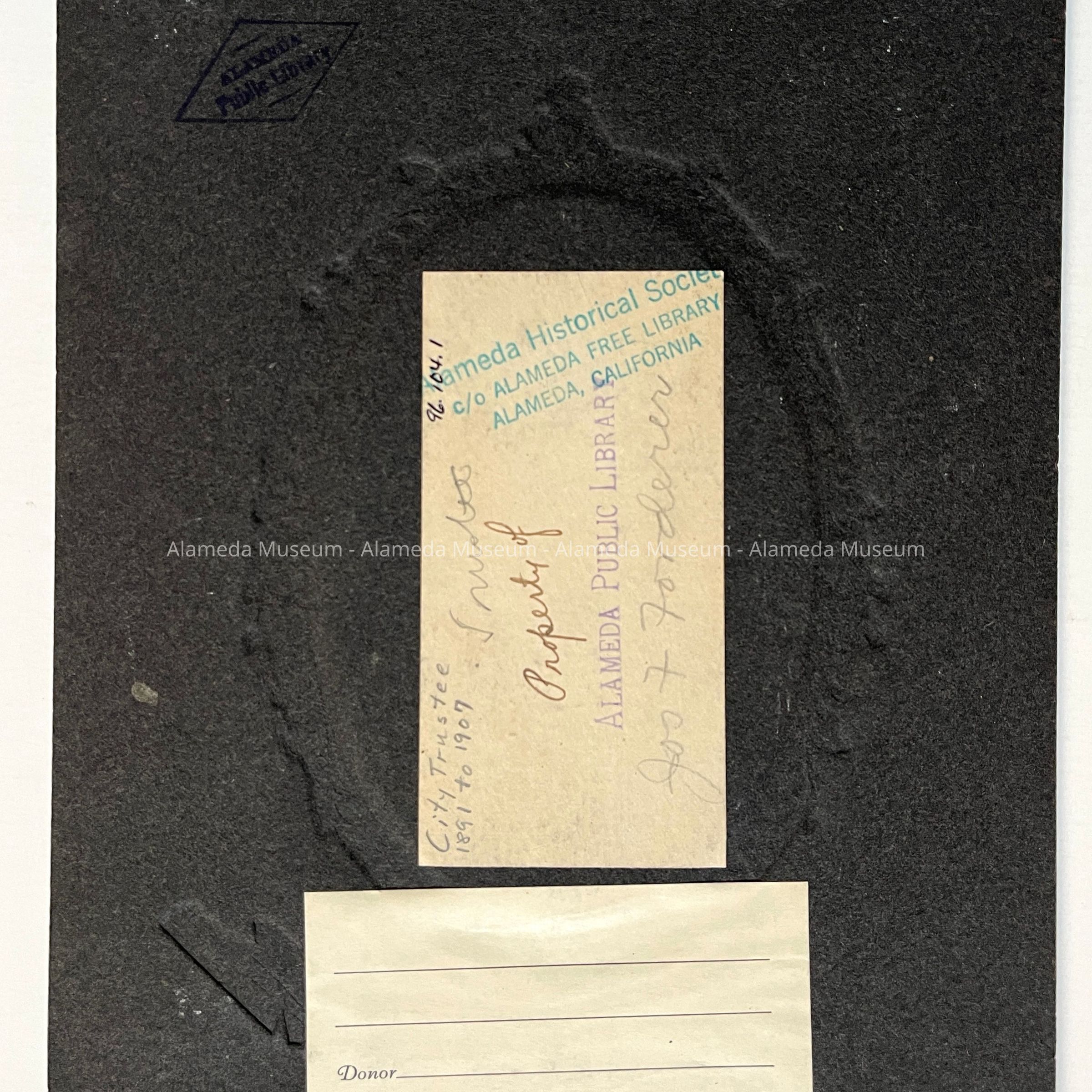 Description: Lt. sepia-toned black/white photo mounted on charcoal paperboard. Photographer: Comfort, 1351 Park St., Alameda. Typed description label is affixed to the lower margin of the mounting. Nail holes in all corners of the mounting.
