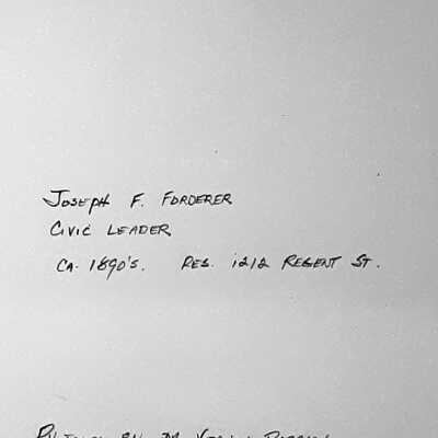 History of Object: Portrait of Joseph Forderer, a City Trustee from 1891 to 1897, during which time the Alameda City Hall was built. He resided at 1212 Regent St.