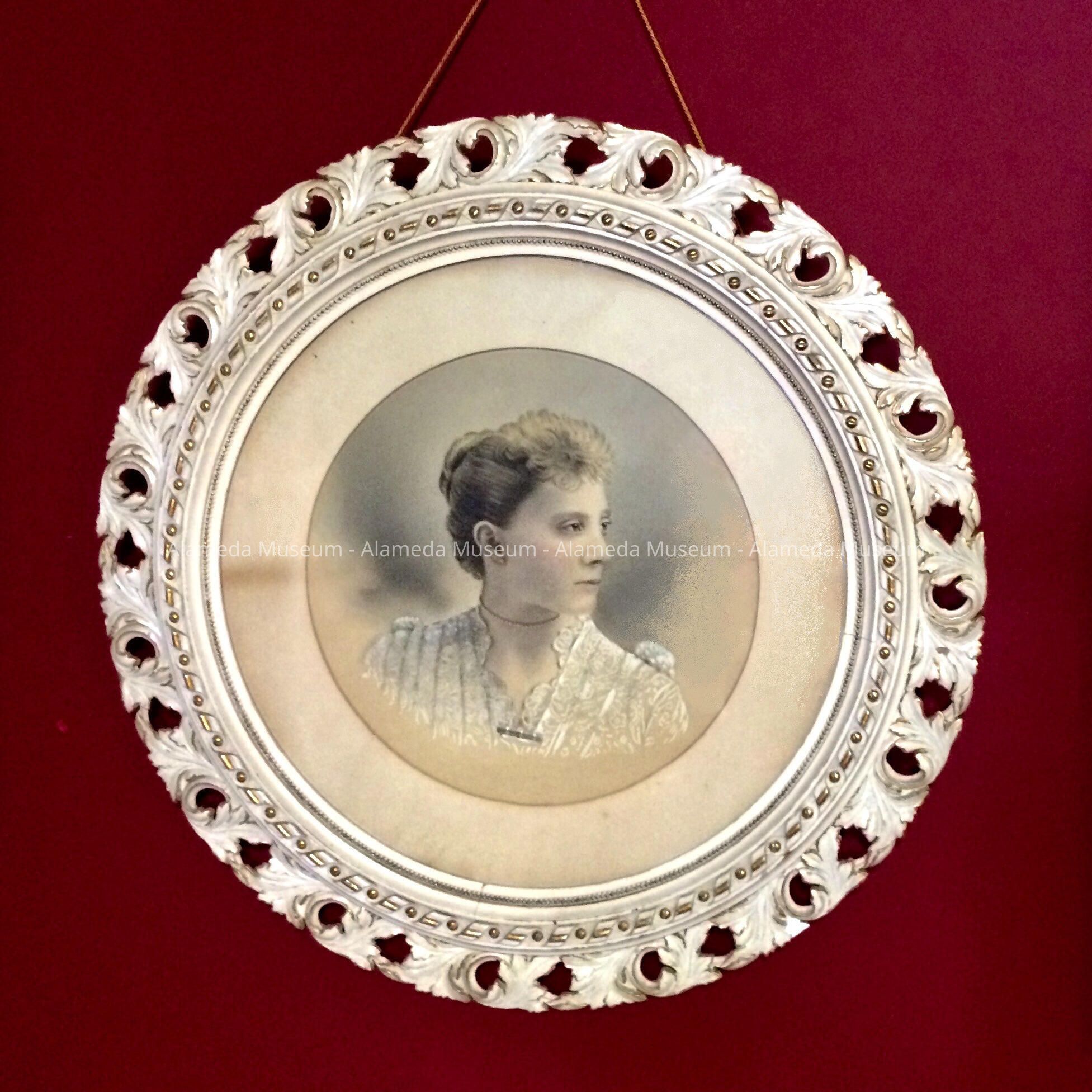 History of Object: Photographic portrait of Mary Frances Thornton, born San Francisco Sept. 29, 1870, and brought to Alameda by her parents in 1875. The photo was taken upon her graduation from Alameda High School. The portrait originally hung in the Thornton parlor, 1479 High St. Mary was the daughter of Abel Thornton, pioneer farner of the East End. Thornton owned & cultivated land now known as Liberty Avenue. Miss. Thornton, mother of the donors, married their father, Fred Linderman, in 1895.