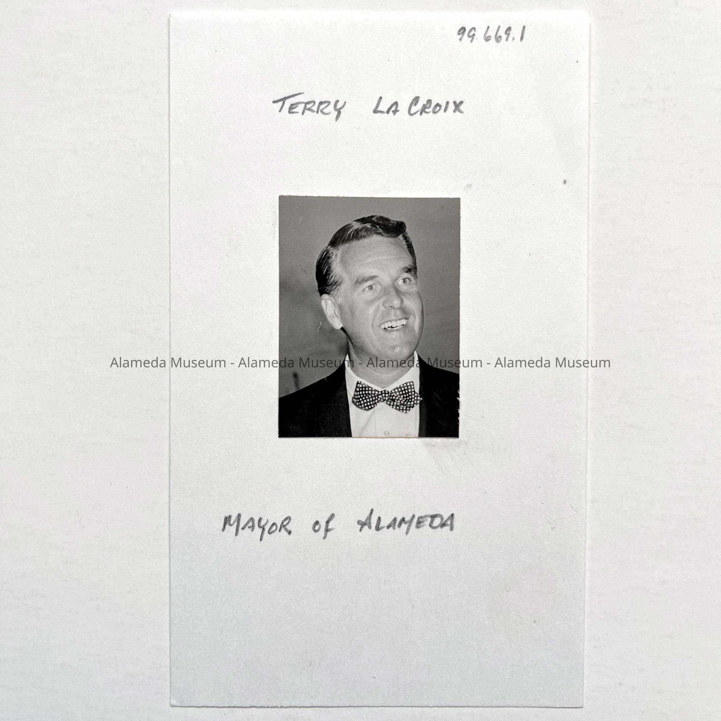 History of Object: Head and shoulders portrait of Alameda Mayor Terry La Croix. This photo was from the files of the Alameda Times-Star.