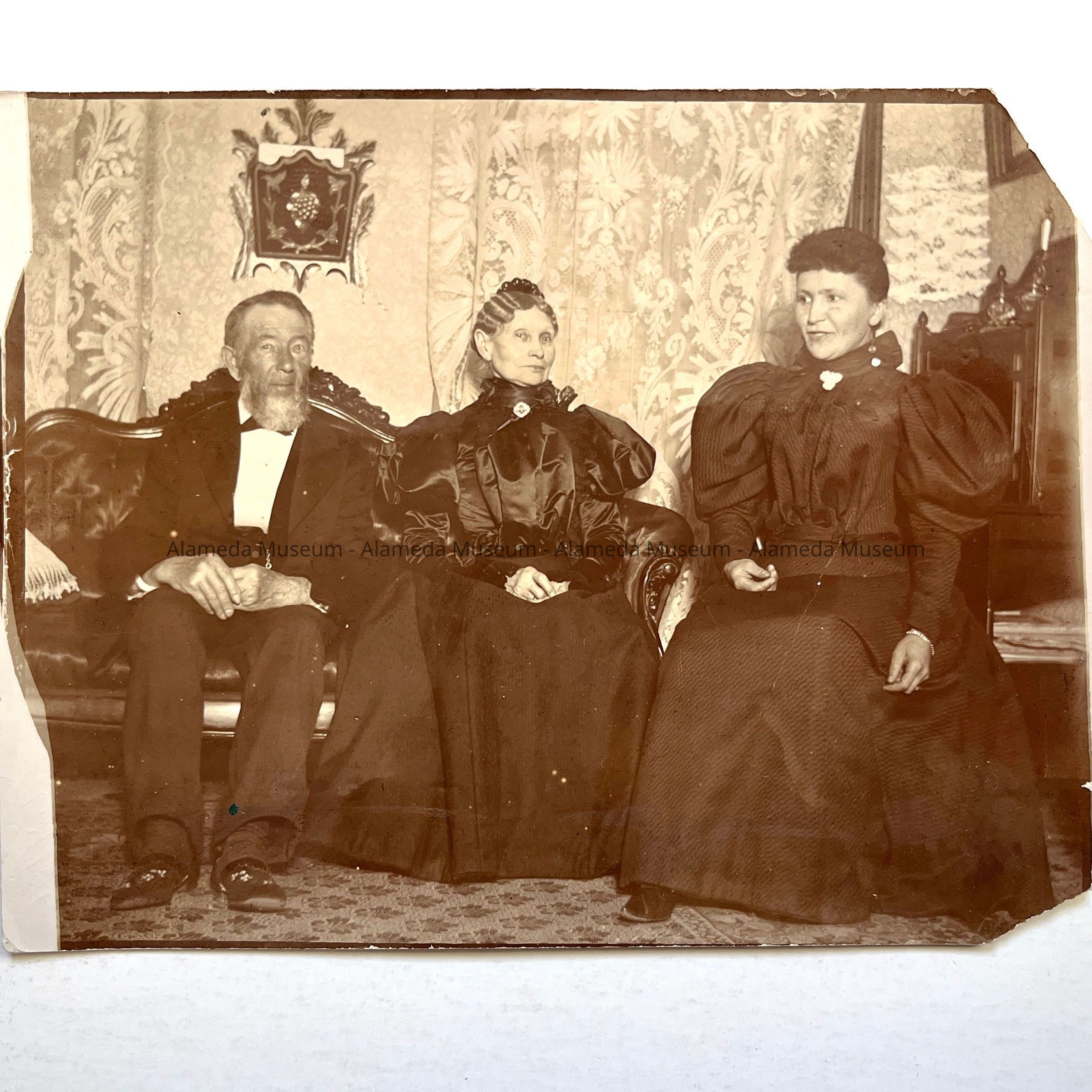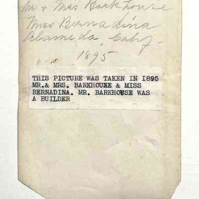 History of Object: Parlor portrait of Mr. and Mrs. F. W. Barkhouse and a Miss Bernadina taken in 1895. Mr. Barkhouse was a builder.
