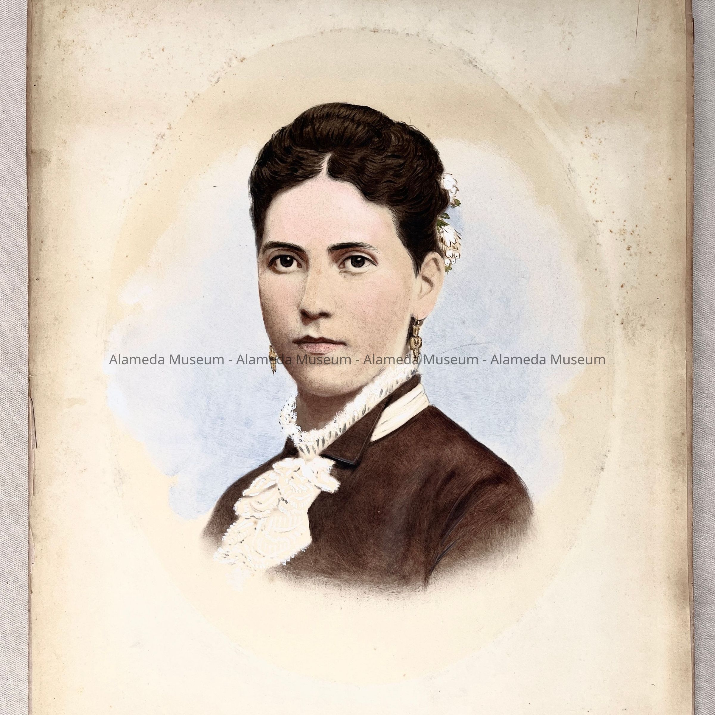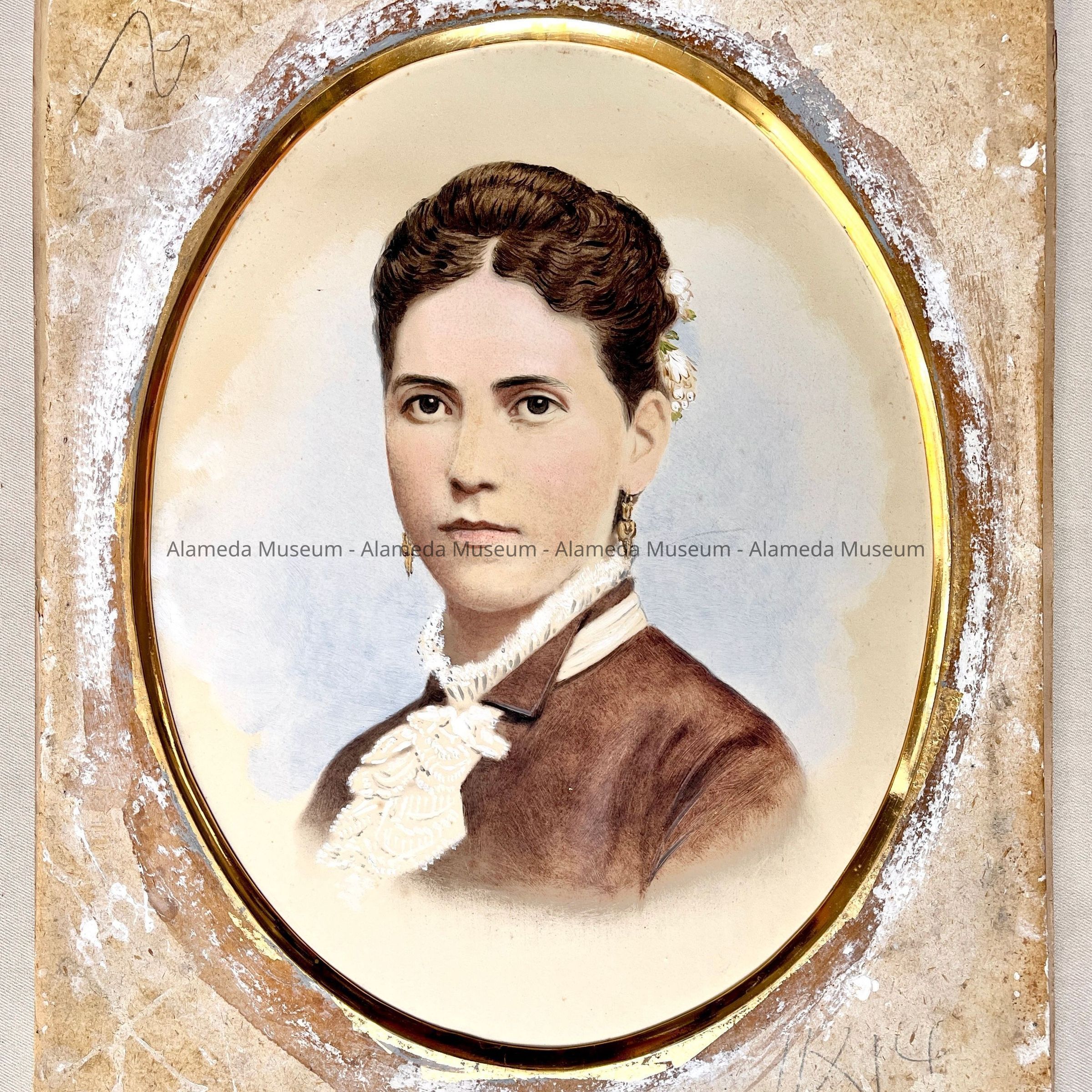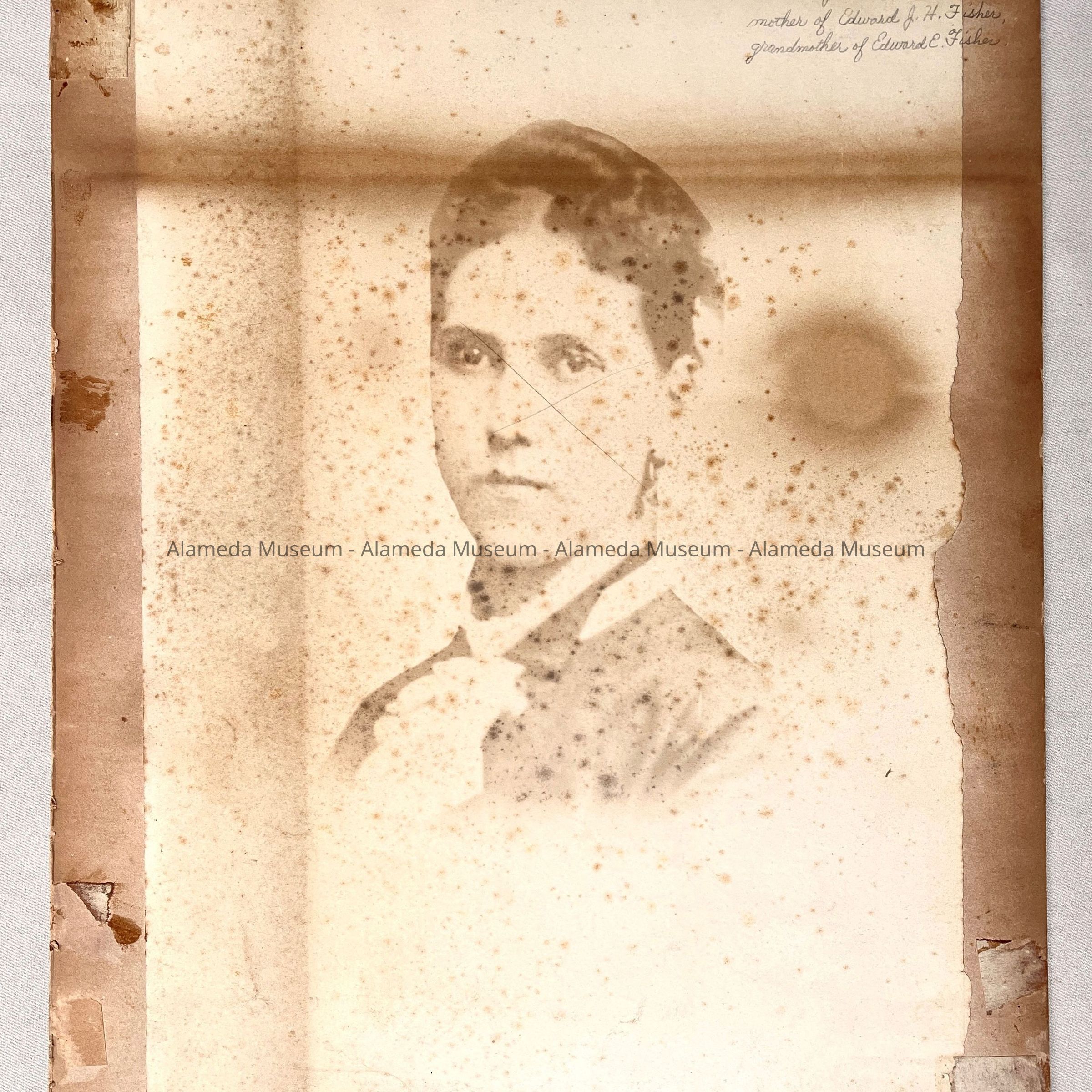 Photographic portrait of Mrs. Andrew J. Fisher, mother of Edward J. H. Fisher, and grandmother of Edward E. Fisher. The Fisher family were old time residents of Alameda.