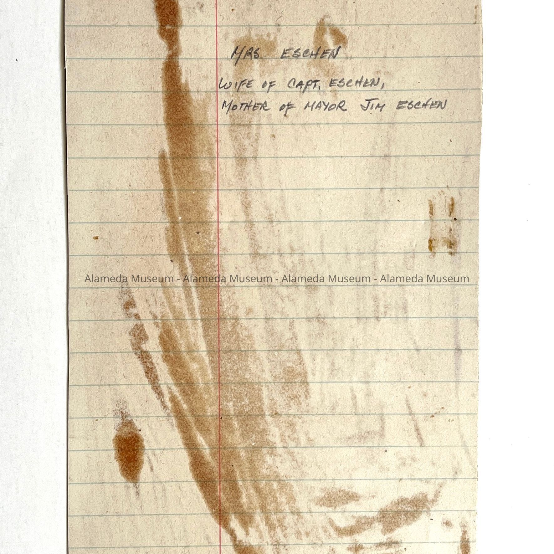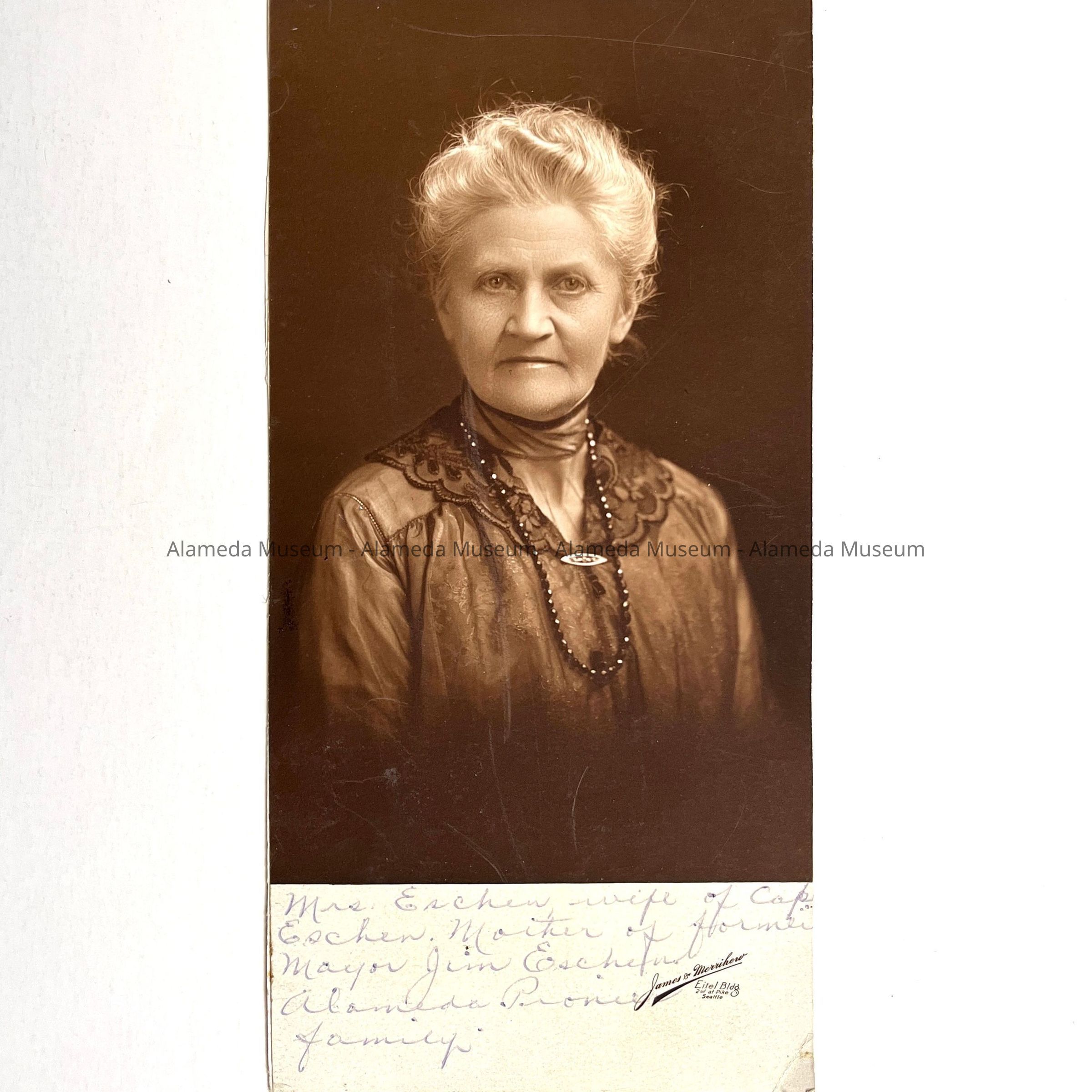 History of Object: Portrait of Mrs. Eschen, wife of Captain Eschen, and the mother of former Mayor Jim Eschen.