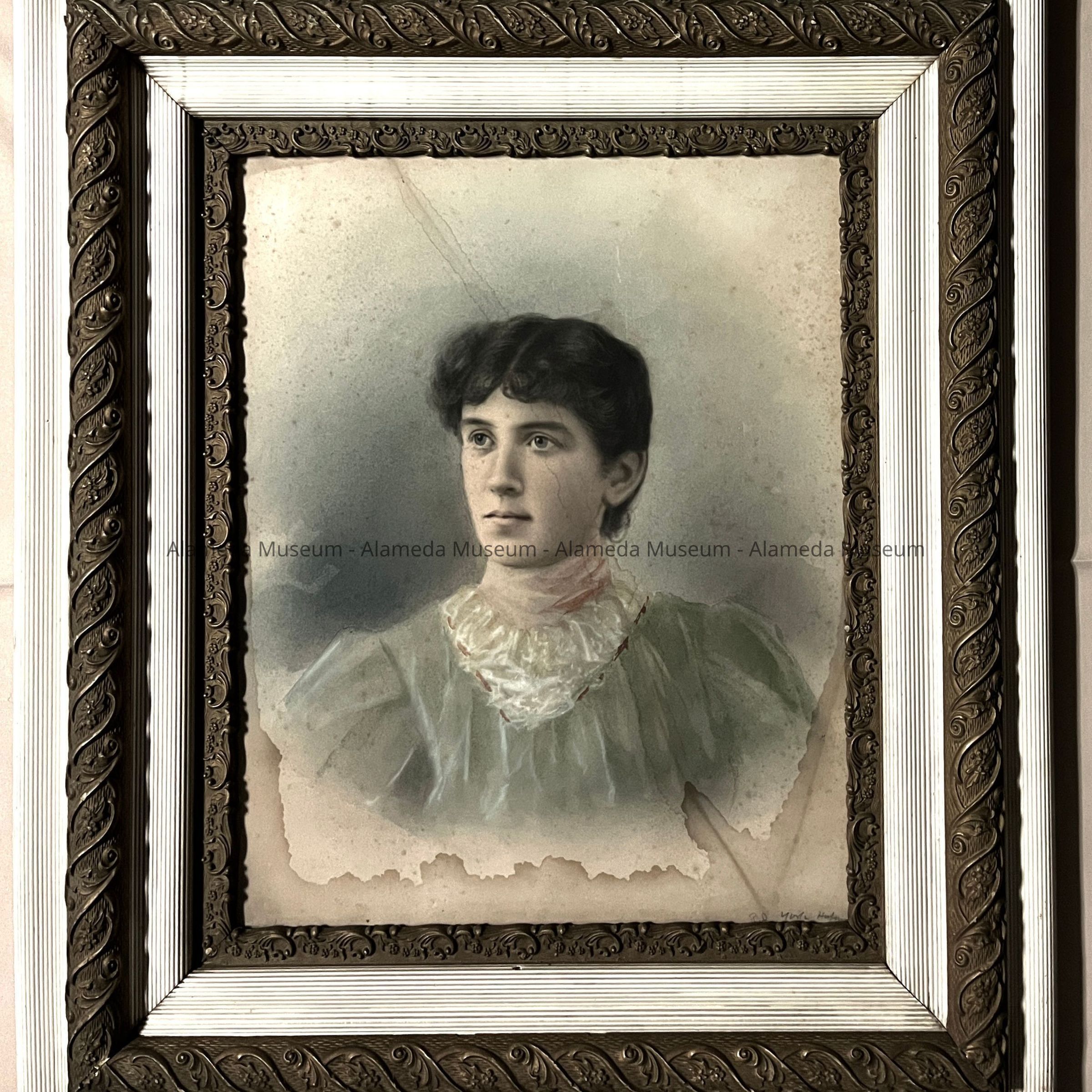 Description: Photographic portrait (accentuated with water colors) in ornate gesso frame (combination off-white & gilt).